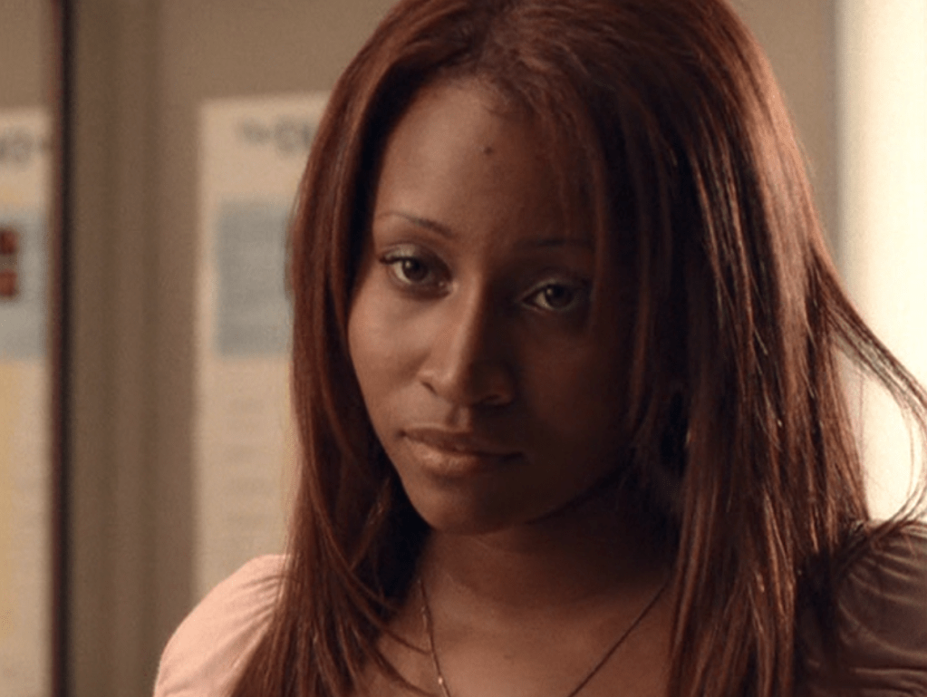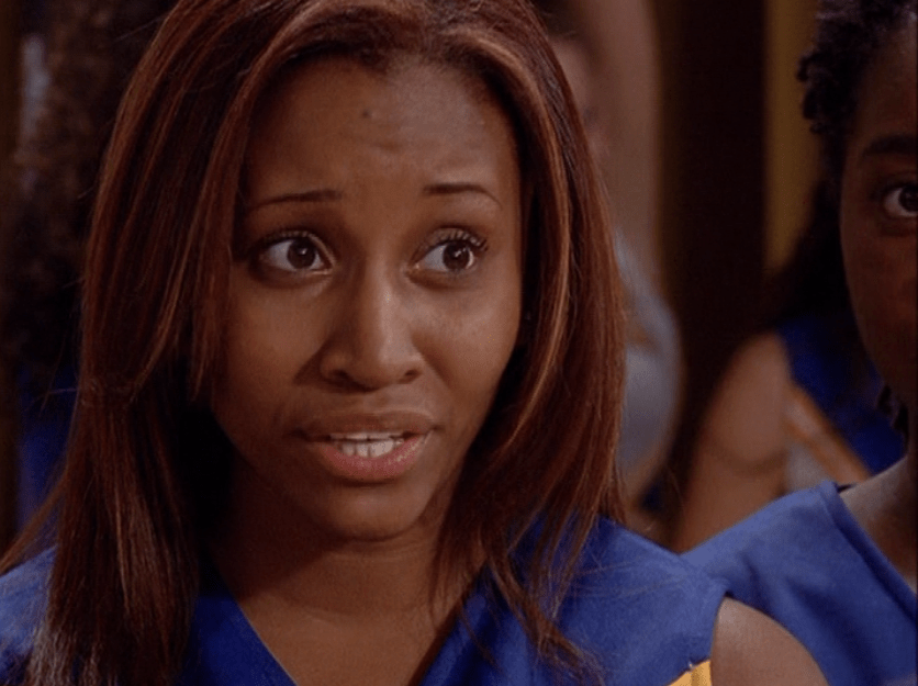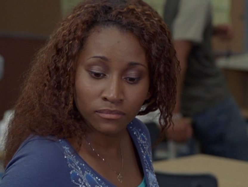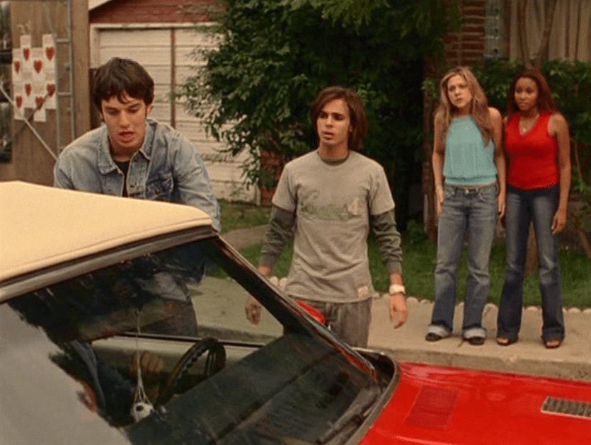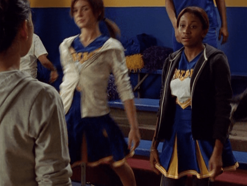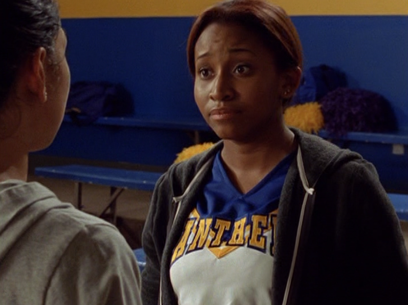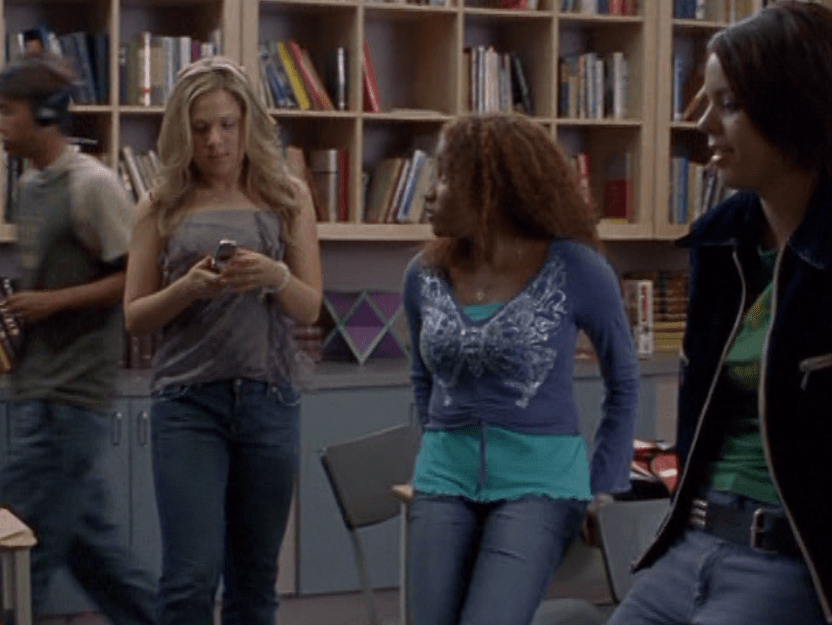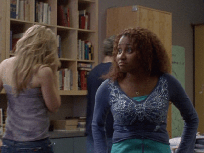 Hazel is seen first in her Spirit Squad uniform, and then I love the look on her face when she’s grilling Paige about Mr. O. She wears her hair down and straight with an orangey floral top, and her brows are very waxed, as many of ours were at this time.