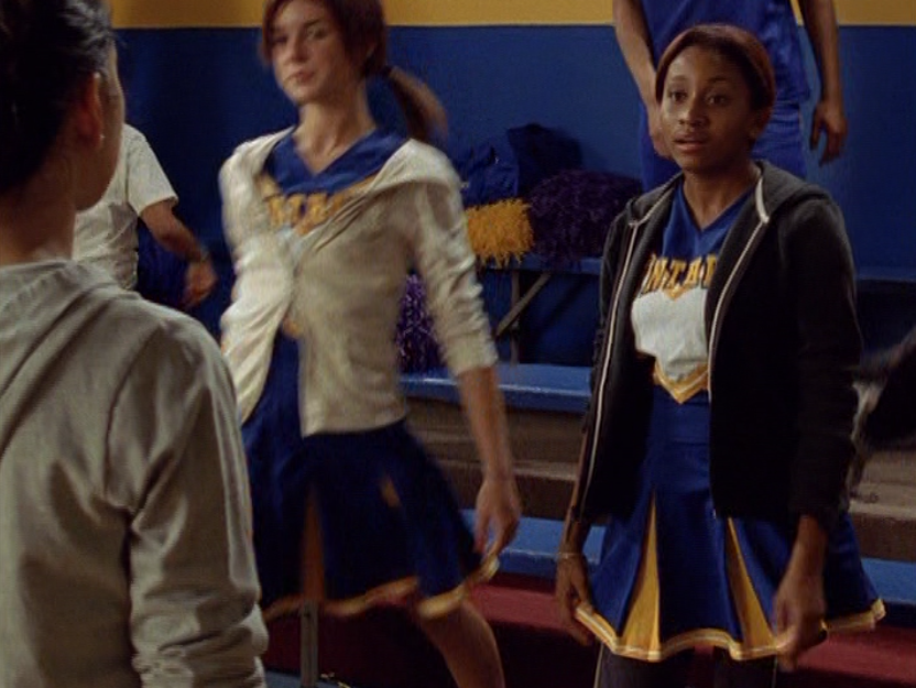 Although Hazel doesn’t really have a big part in this episode, it IS one of her better moments throughout the show. First she wears this New York zip up jacket with her cross body bag, and she’s kinda trying to feed Manny tips on how to reconcile with Paige. Then she’s seen in Pretty Pretty Pretty, isn’t that the name of the store? And I don’t know if she’s trying dresses on, or if she’s really wearing this halter with her bra straps hanging out. Then she’s seen in her Spirit Squad uniform, and finally, I don’t know why she wears all black to the dance. Wonder if Paige “made” her. Also would like to take a moment for Hazel’s eyebrow game. Skinny and sharp, I always love when the brows are so skinny you can see the brow muscle underneath, you know what I mean? Oh yeah and this is where Hazel TELLS PAIGE OFF! Just this once. And it’s great.
