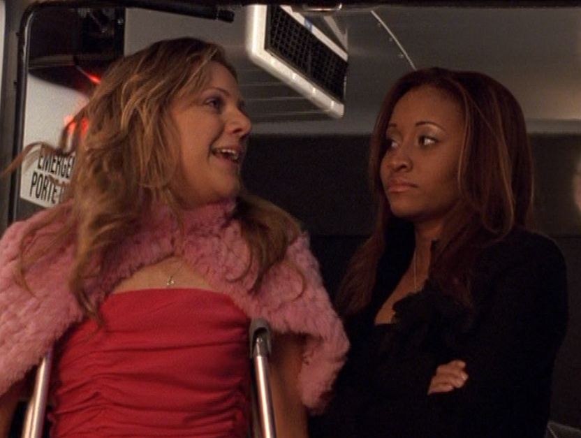 I hate this for Hazel, so terrifying every time. She wears her hair down, curly, and red. She’s got layered tops on which was always around during this time, and I also got a shot of her shimmery nails. Why the heck anyone would hug Sauve under any circumstance I don’t know. Maybe would have been a little more believable if Hazel’s knees buckled or something.