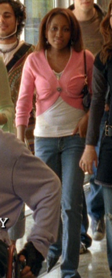 Hazel time! She’s, well, part of the group, but doesn’t have many lines or much screentime like usual. She returns to school in this cropped pink cardi – I definitely had one like this – layered over a white tank, flare jeans, and pointy-toe heels. Next she’s at The Dot in a cowl neck tank of green and pink paisley.