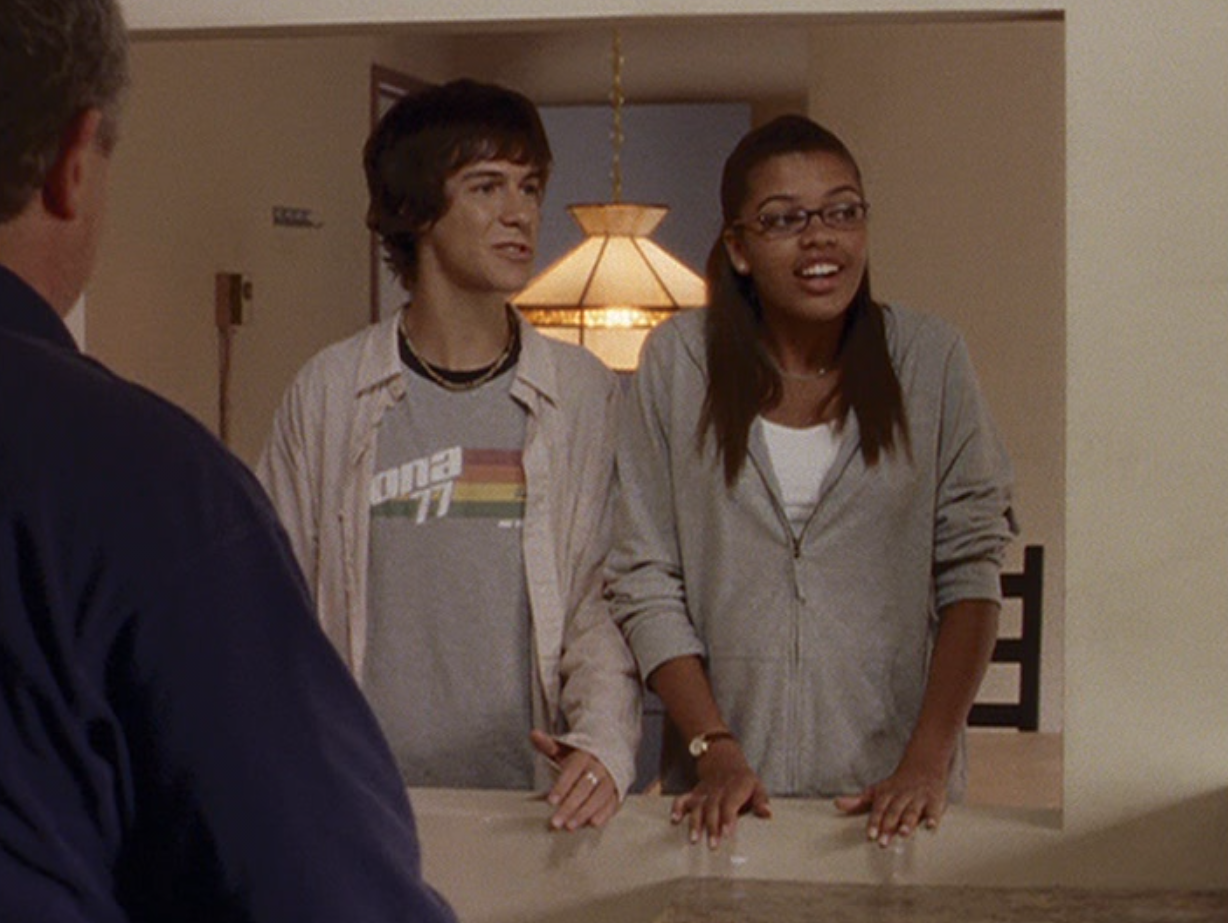 Here’s our super-not-fun-time-with-JT again. He wears baggy cargo pants as he meets with his client. At school he wears more of the usual preppy stuff – layers, collars, etc. His hair looks a little better… not great, but better. And then of course we see him in a hospital gown. Oof. Just… a bummer of a storyline.