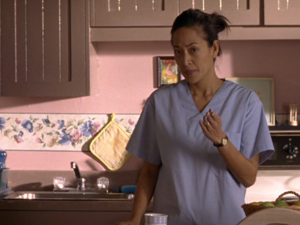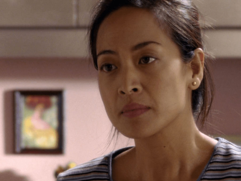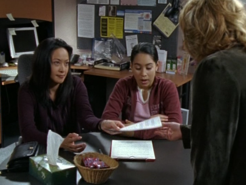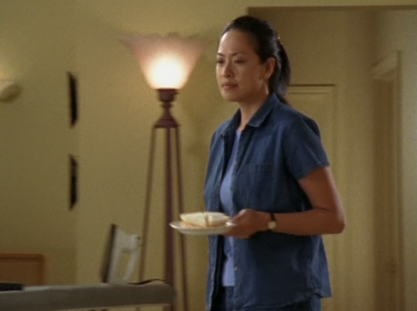 Something about seeing Manny’s mom out of the house, out from under the thumb of Joseph… she looks more empowered, more autonomous, like she does her own stuff out there in the world. She comes to see Manny at school, and it reminds me of when Michelle’s mom came to see her at school, and also Caitlin’s mom. Julietta wears cropped pants and a jacket. I can’t tell for sure but these might be her work clothes – lastly we see her wearing scrubs back at home.