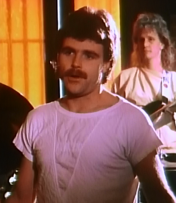 This is where we really get a sense of Mike’s cool 80s rocker style. I love the white tee with cutoff sleeves.