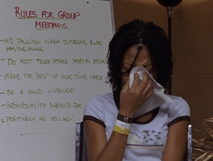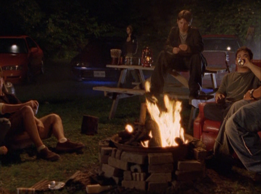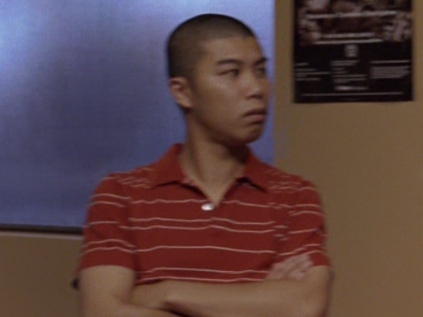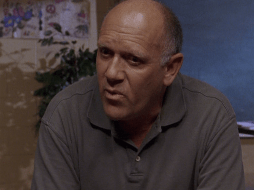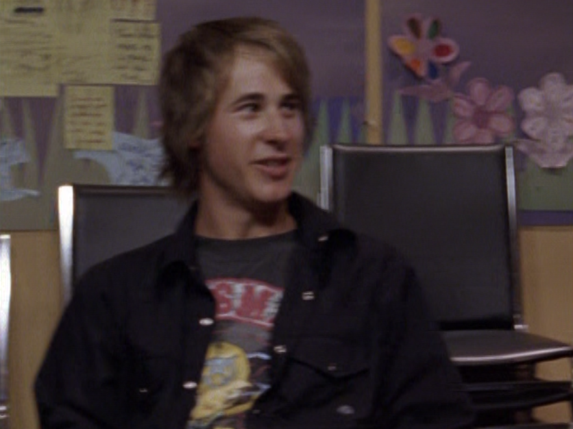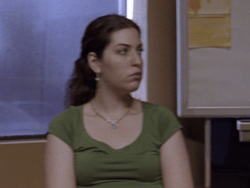 Rando roundup for today includes this like, lady who supervises teachers in training. So she’s watching Mr. O like a hawk. And she does look scary. She wears a brown blazer and has fluffy bleached hair. Next are these girls in the hall, reacting to the accusations about Mr. O. We see some tight layered shirts, a large pearl necklace, and a cross body bag. Then there’s the cops in their little cop outfits. Then this shot on the front steps shows more silhouettes of the time – baggy jeans on dudes and flare jeans on girls.