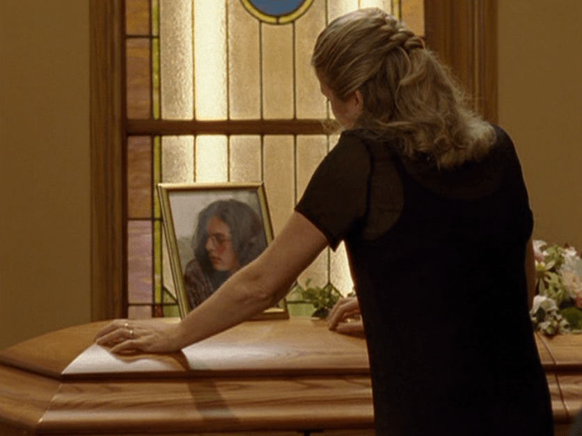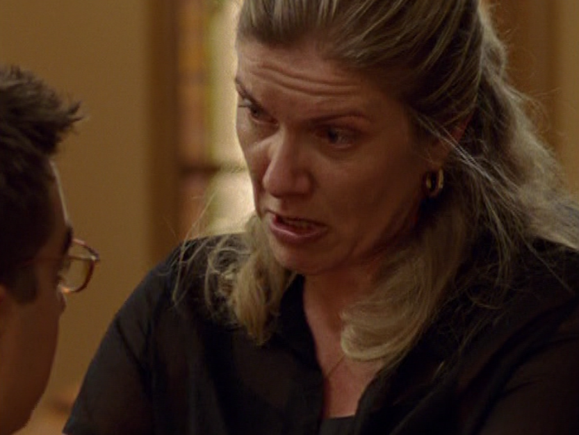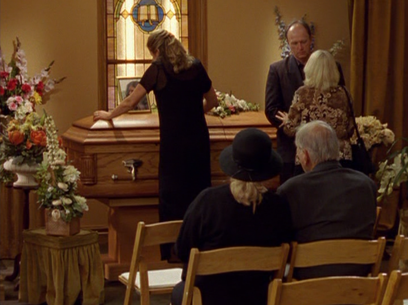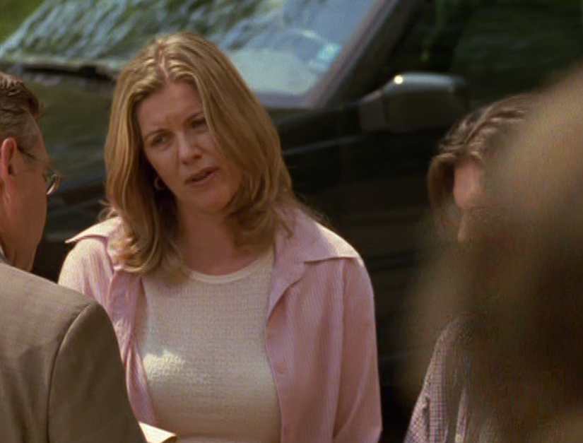 Where is Rick’s dad? They couldn’t get some random guy to play him for a second? Oh well. Here’s poor Rick’s mom I guess. Gah, she was already stressed enough, this is gonna push her over the edge. She seemed really comforted by Toby’s presence, bless him. Oh yeah, fashion, right – she wears her hair pulled back and a black dress.