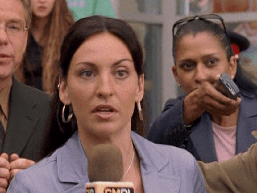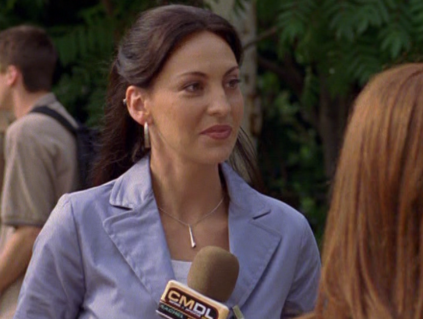 Yuck, Rachel Rhodes sucks! This time she’s got on like a grey suit, her hair half up, and those hoops. And she’s just so irritating. But Sean smashes some of her equipment. I wonder if he ever got in trouble for that!