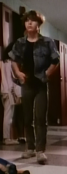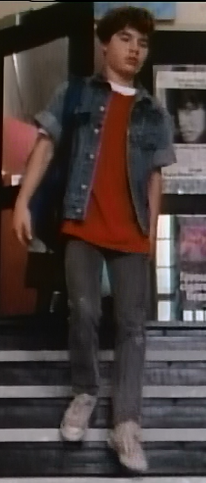 Rick of course has a pretty repetitive wardrobe – because he’s not looking to impress! He’s the coolest bad boy in school! Today he sports a black tee, jean jacket, and some skinny army green pants. The look is completed with some classic white tennies. Thumbs up!