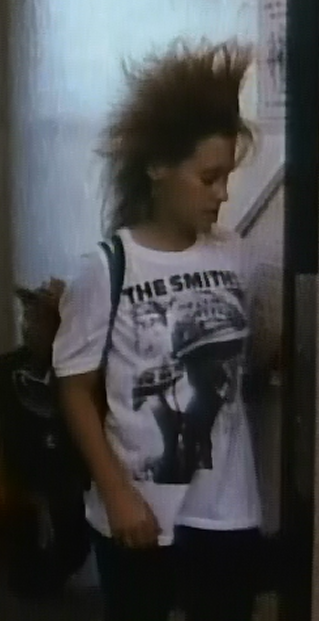 So, I try very hard not to use any screenshots from when the beginning credits are rolling. But, even though this is Spike’s reunion, it was really hard to get come good shots of her outfits. So I had to settle for this one with giant text all over it. Sorry. But she wears this hot, deep red dress and some jewelry. Talking about how she feels like this is the prom she never got to go to. However, I remember her being at prom so I don’t know what she’s talking about. And lastly, we see her in a ringer tee after letting investigators raid her computer.