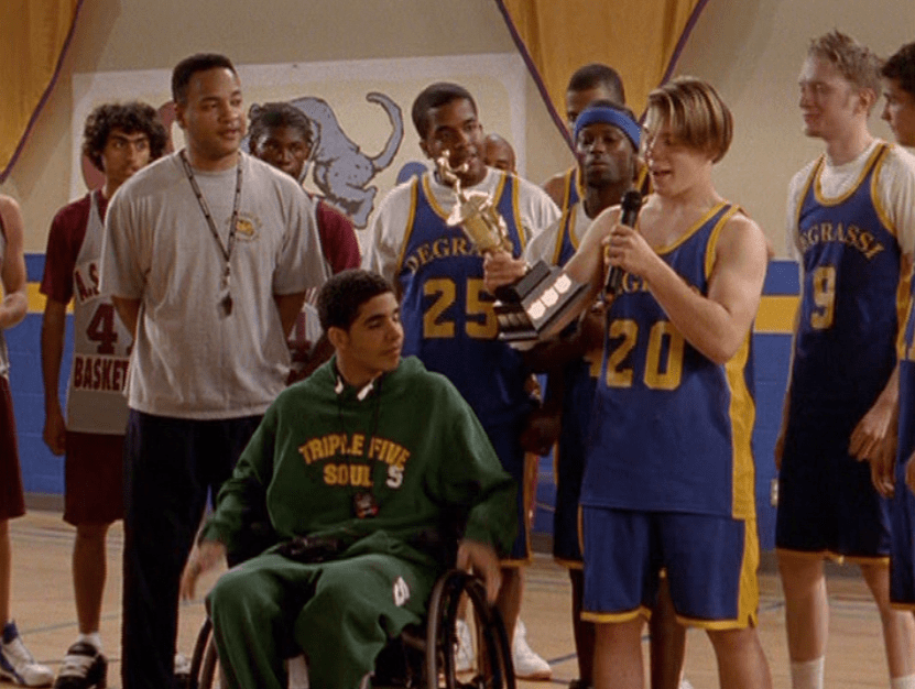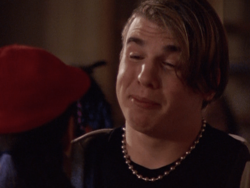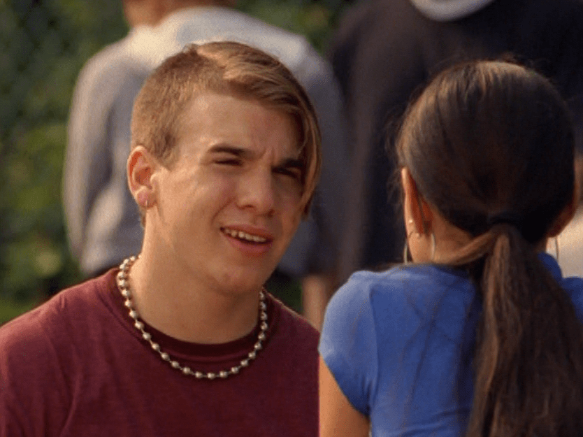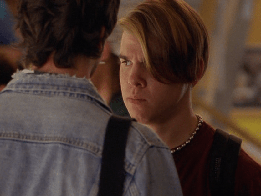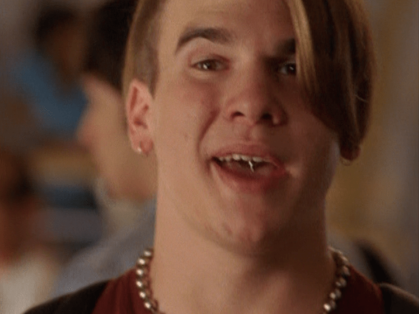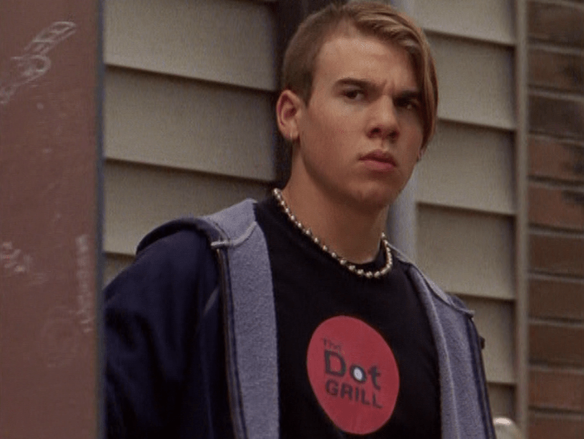 So yeah, this is where Spinner comes face to face with his guilt as Jimmy returns to school. Even though Spin is scum, this IS him looking his best for sure. His hair still slaps, and he wears tees with baggy pants including casual khakis, and that ball bearing necklace. I also got a shot of his tongue ring for your viewing pleasure. This pic of him in his basketball jersey gives me so many feelings. He looks so clammy. But also he looks so happy, in a way that I feel kinda sorry for him. But anyway, he sucks!
