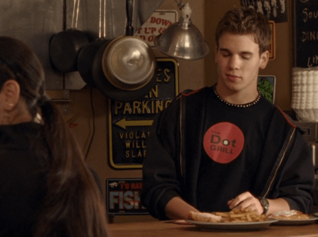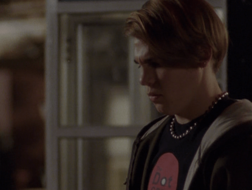 Spinner’s not dressed very excitingly, but I do enjoy his overall skater look. Earrings, tongue ring, a ball bearing necklace, tee shirts, and so on. The tongue ring is really interesting, ya know? I don’t think I knew many high schoolers with their tongue pierced. That’s pretty adult. He’s also seen here in his Dot work shirt. And he is still VERY much disliked and ostracized amongst his peers in the aftermath of Jimmy’s paralysis.
