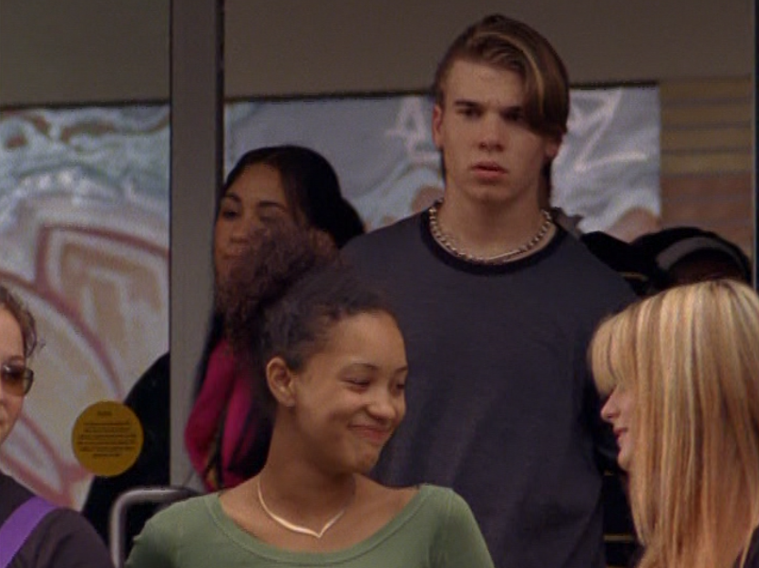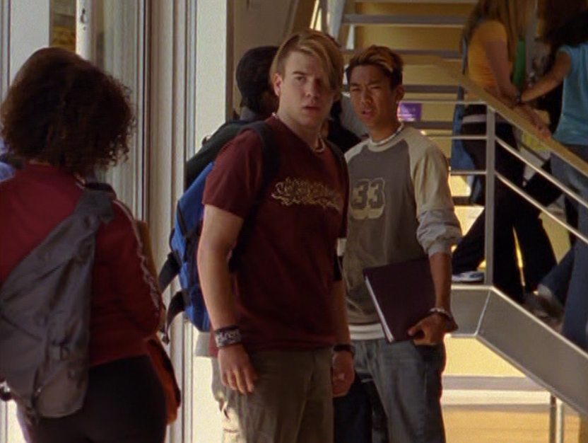 Spinner’s not dressed very excitingly, but I do enjoy his overall skater look. Earrings, tongue ring, a ball bearing necklace, tee shirts, and so on. The tongue ring is really interesting, ya know? I don’t think I knew many high schoolers with their tongue pierced. That’s pretty adult. He’s also seen here in his Dot work shirt. And he is still VERY much disliked and ostracized amongst his peers in the aftermath of Jimmy’s paralysis.