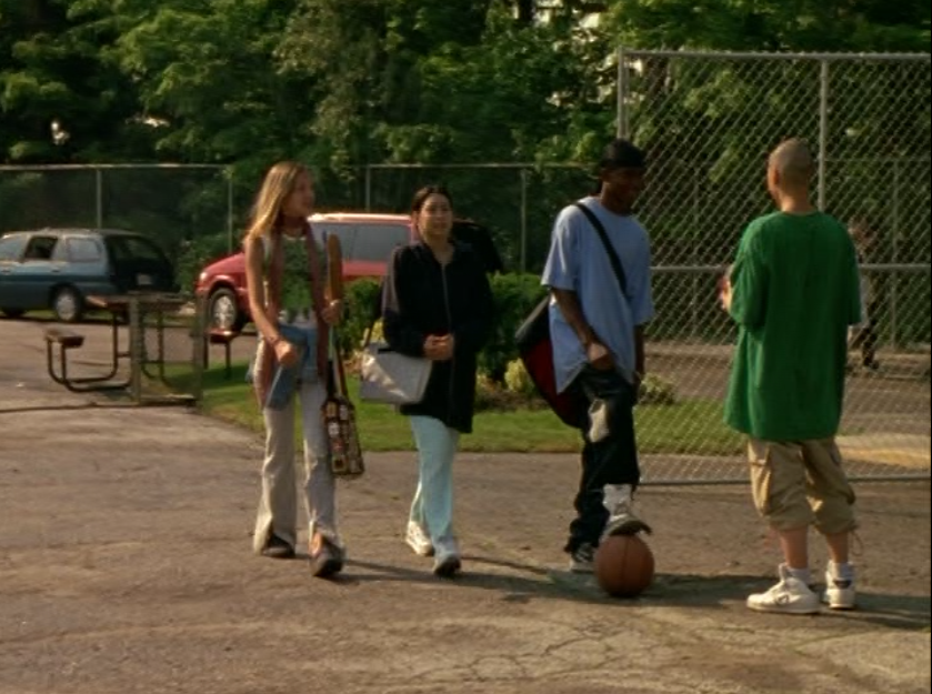 Next, that white and bloody shirt over a black long sleeve with exposed seams of green. And then… AAAAH the red and black stripes, just soooo 2000s mall goth and I am living. We see a couple more outfits very briefly just to show that time is passing. So let’s skip ahead to…