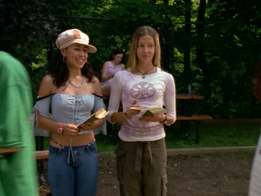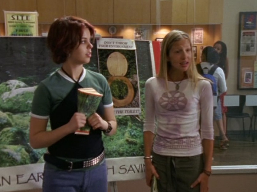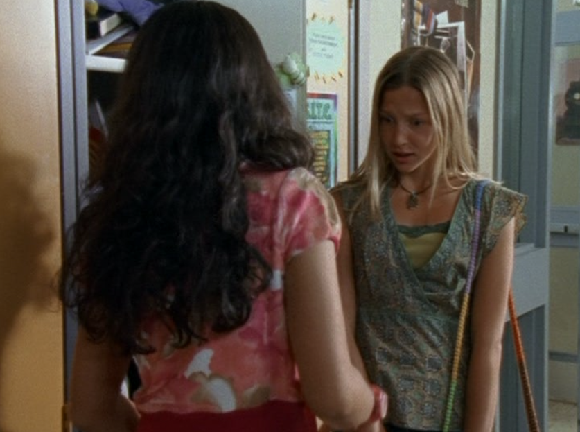 Next up, is an Ellie ‘fit for the ages. The white 3/4 sleeve tee with splits and buckle detailing. This is 100% something I would have worn, not that anyone’s asking. She accessorizes with spiky, chainy, chokery necklaces. She wears a red plaid pleated skirt that has some kind of suspender or strap hanging off. We also have fishnets and these amazing chunky wedge boots. It’s an amazing look and a real shame that Paige spilt something on it. She dons a big yellow raincoat for her interview with Caitlin.