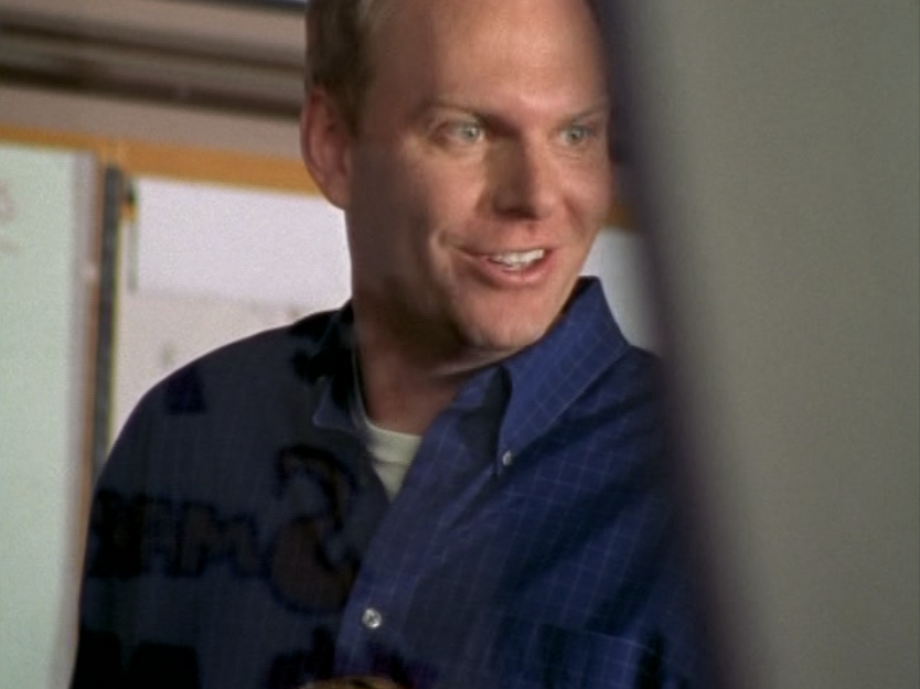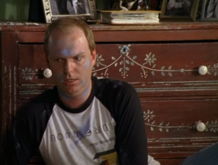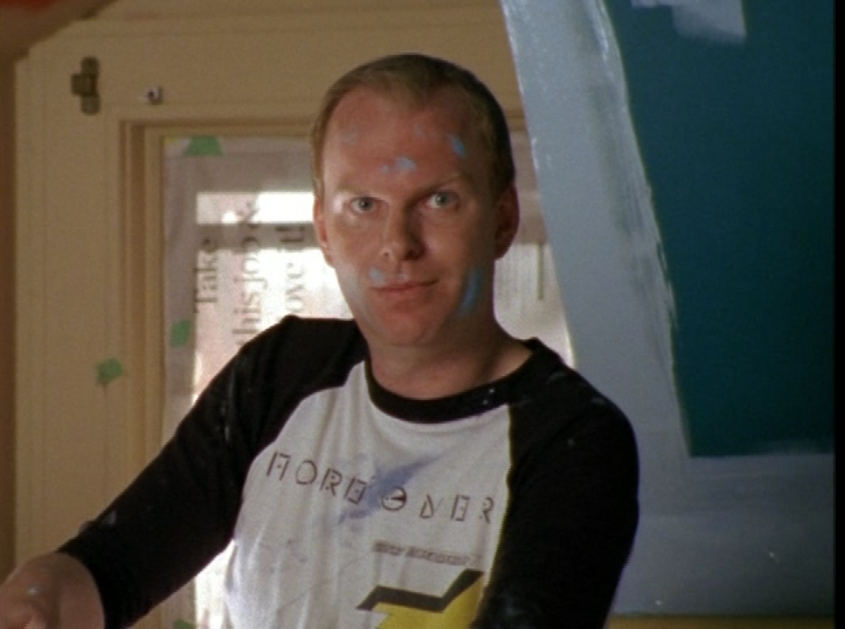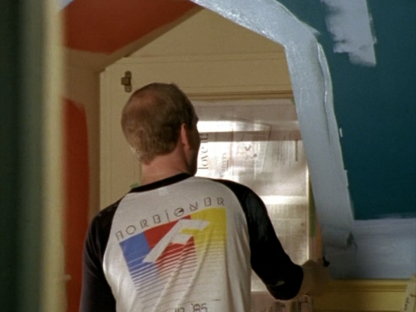 Snake here, has also fallen victim to Spike’s “fake labor” test, the poor thing. He’s wearing a Foreigner shirt, which is awesome. But it’s also his painting shirt, so maybe he doesn’t really like Foreigner that much, so that’s not so awesome. I think it would have been cooler if he was painting in an Iron Maiden shirt, like we used to see him wearing in junior high. Oh yeah, and there’s also a shot here of him in a blue button down.