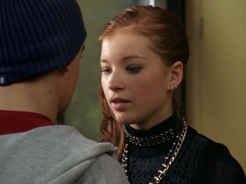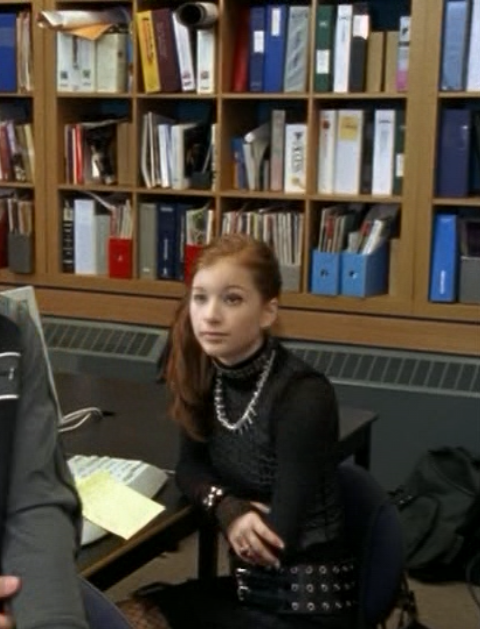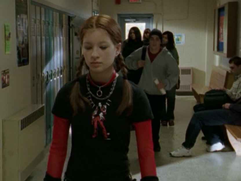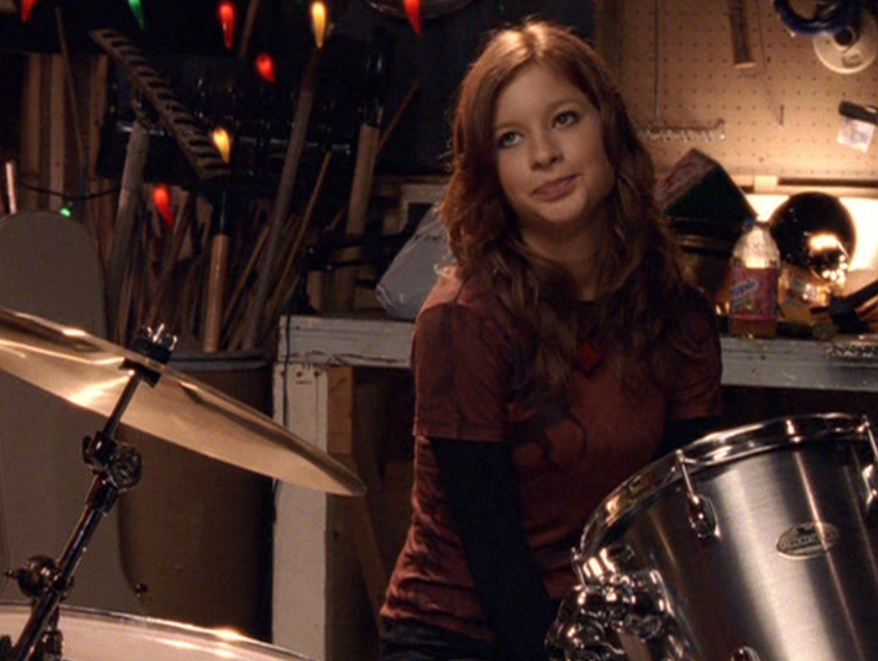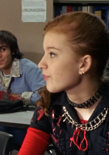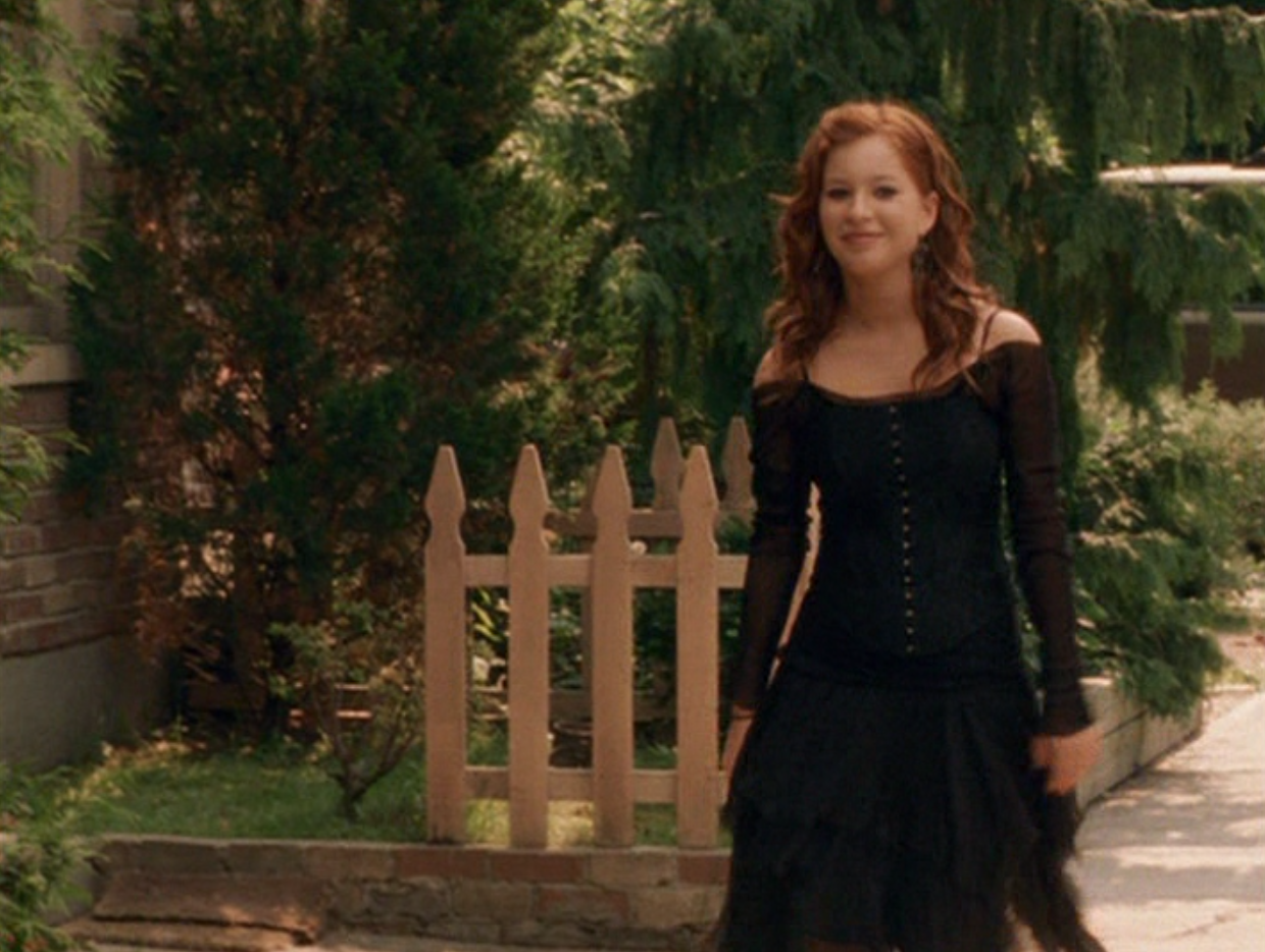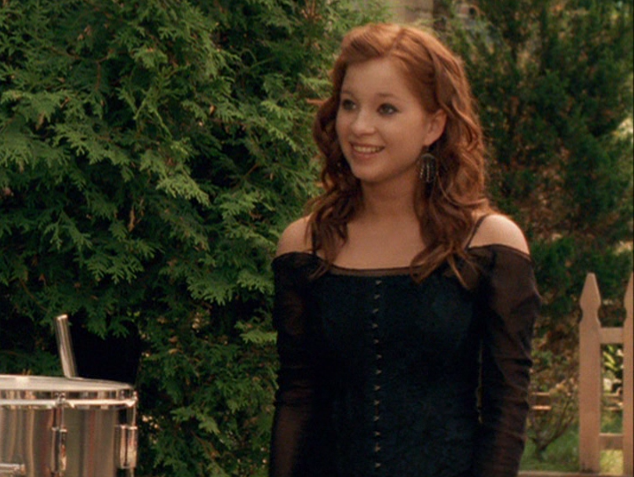 Here we are, in Ellie’s suck era. Like, she sucks. And also, as Alex once called her, she’s “a suck”. She’s traded in her crimper for a waver, she’s simping over a f*ckboy, and she’s cringily playing the drums. First she’s shown in a long sleeve shirt under short sleeve shirt under long sleeve shirt (Family Guy reference anyone?) Then we see her in her O-ring choker. And now let’s talk about THE outfit. Even though Ellie is already being drained of her style and personality at this point, I do enjoy this outfit and the *jaw drop* reveal they do of it. However I just noticed the sleeves don’t look very conducive to drumming. So what they’ve done with Ellie’s style here, is she’s basically a normie, but in darker colors. Though subtle, this dress is very cool with the off-the-shoulder sleeves, corset buttons, and ruffly layered skirt. I actually feel a bit sorry for her right here. She was so hopeful.