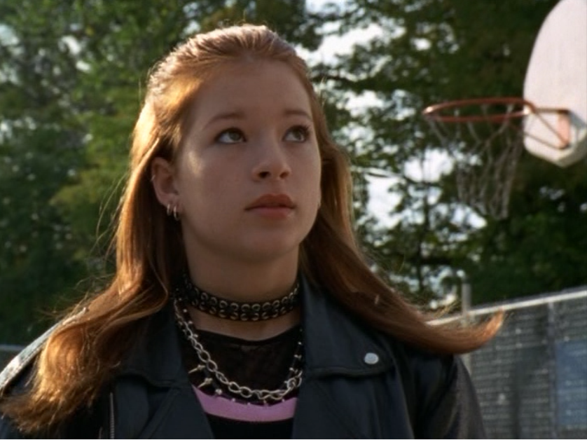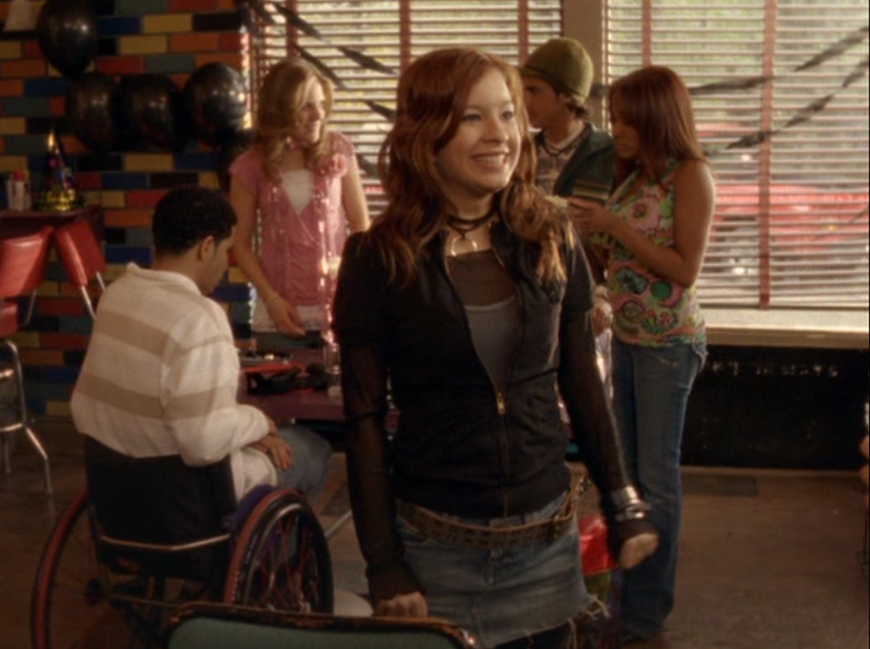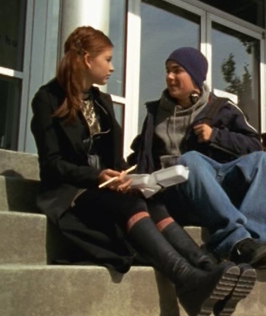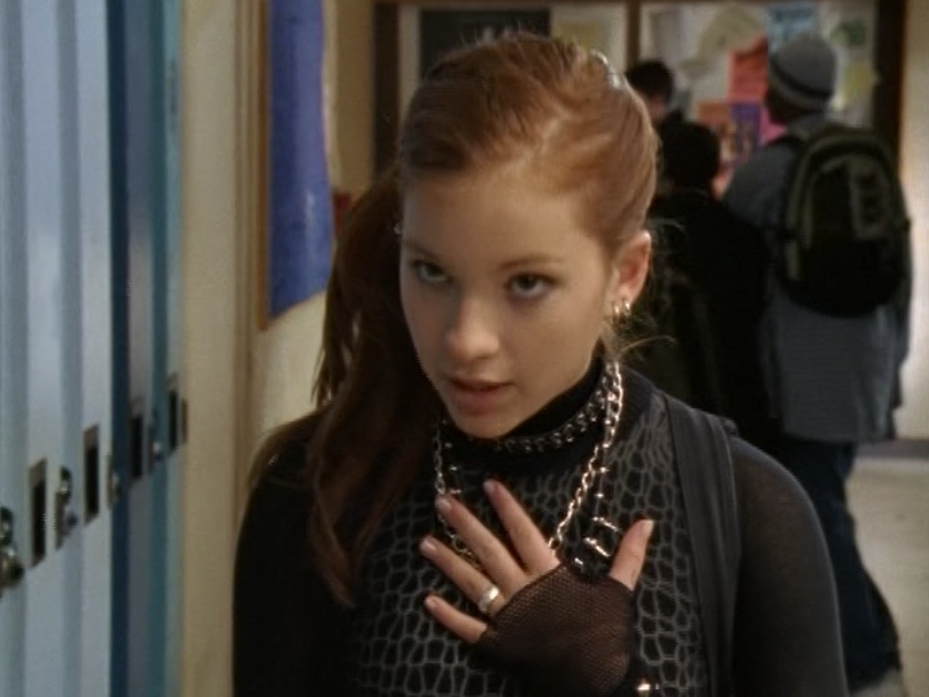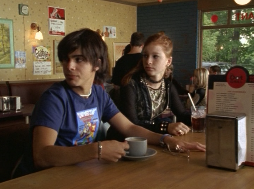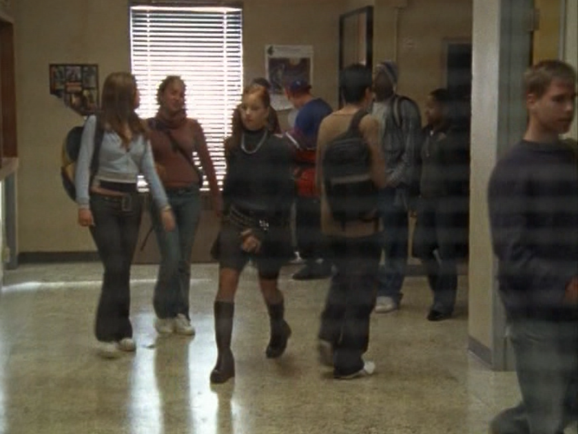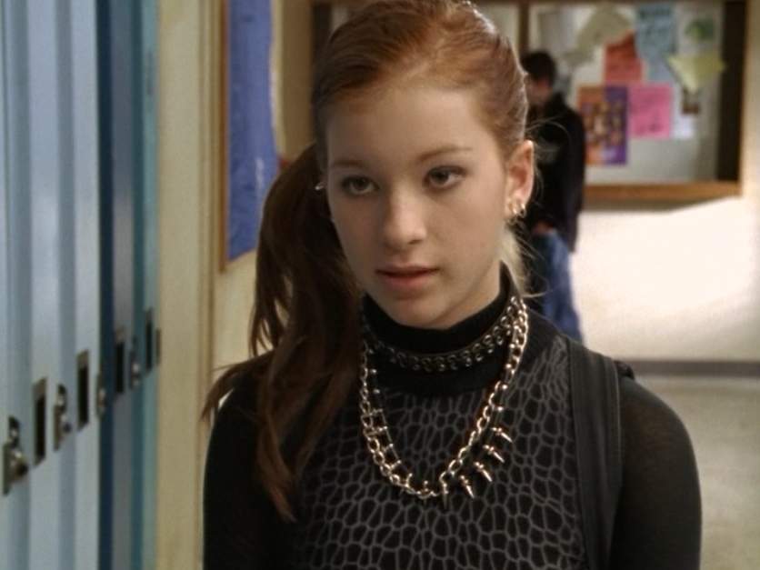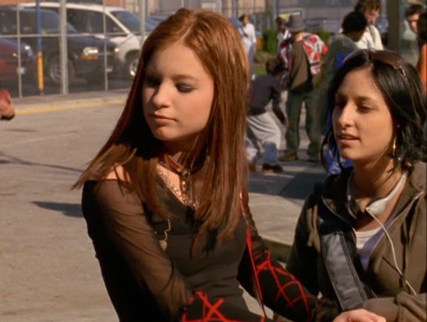 Here we are, in Ellie’s suck era. Like, she sucks. And also, as Alex once called her, she’s “a suck”. She’s traded in her crimper for a waver, she’s simping over a f*ckboy, and she’s cringily playing the drums. First she’s shown in a long sleeve shirt under short sleeve shirt under long sleeve shirt (Family Guy reference anyone?) Then we see her in her O-ring choker. And now let’s talk about THE outfit. Even though Ellie is already being drained of her style and personality at this point, I do enjoy this outfit and the *jaw drop* reveal they do of it. However I just noticed the sleeves don’t look very conducive to drumming. So what they’ve done with Ellie’s style here, is she’s basically a normie, but in darker colors. Though subtle, this dress is very cool with the off-the-shoulder sleeves, corset buttons, and ruffly layered skirt. I actually feel a bit sorry for her right here. She was so hopeful.