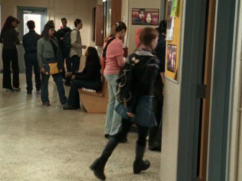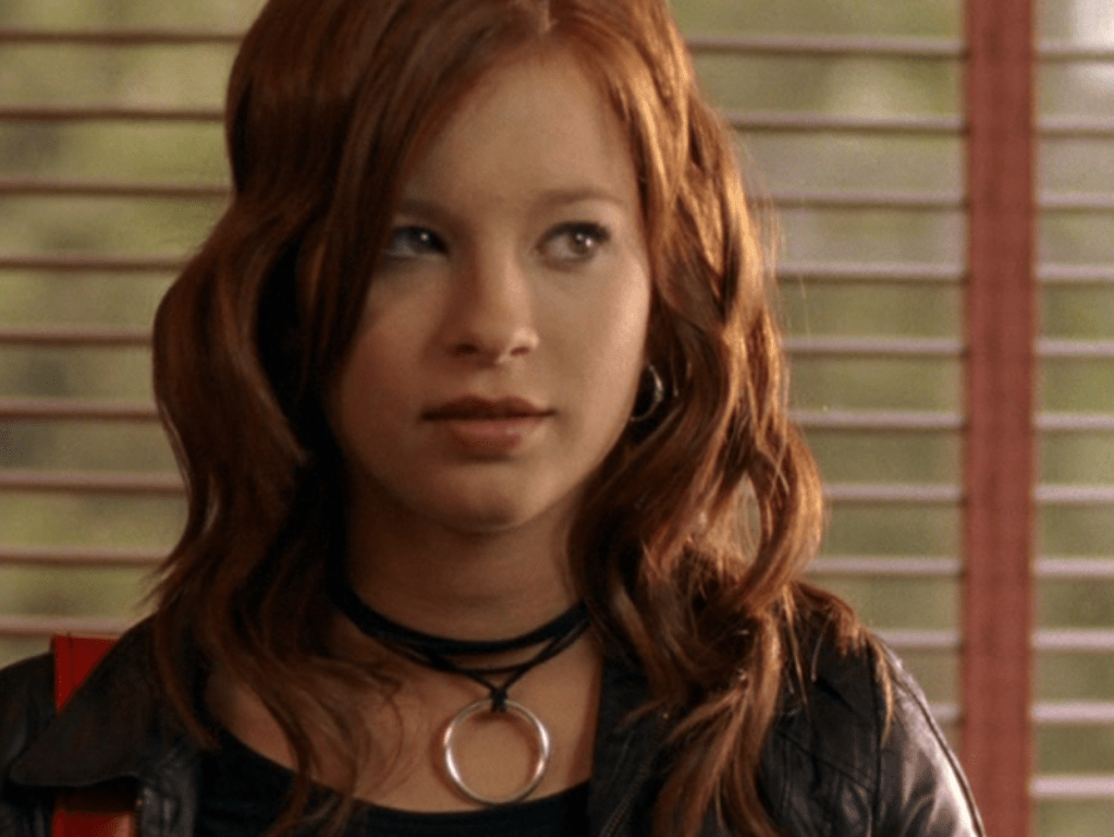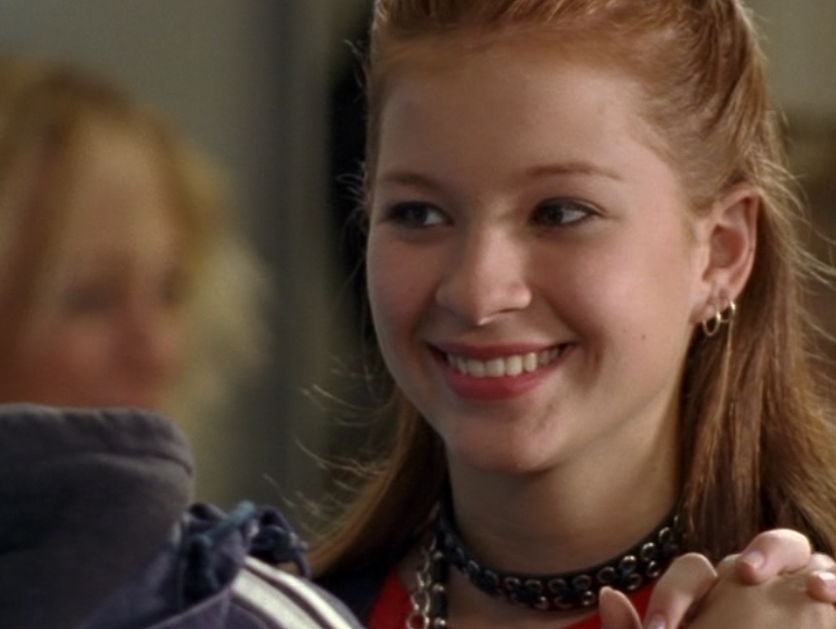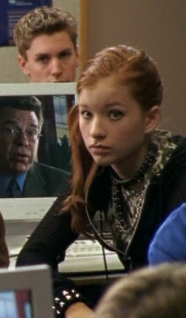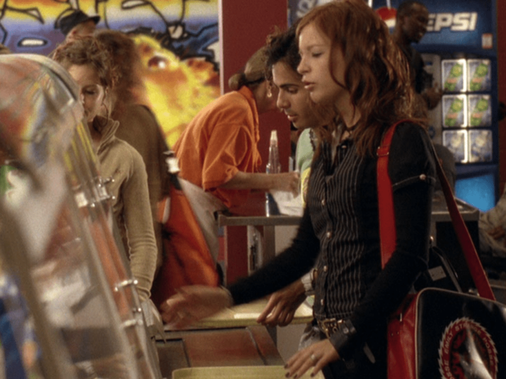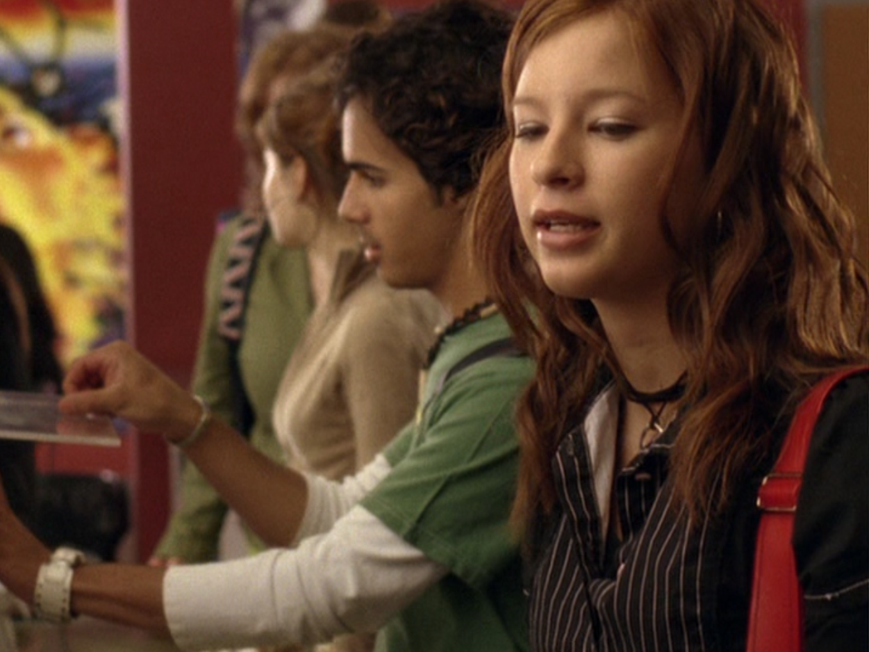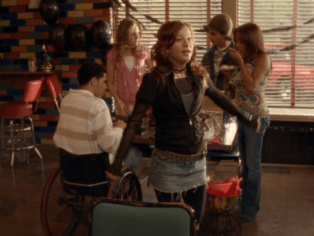Here we are, in Ellie’s suck era. Like, she sucks. And also, as Alex once called her, she’s “a suck”. She’s traded in her crimper for a waver, she’s simping over a f*ckboy, and she’s cringily playing the drums. First she’s shown in a long sleeve shirt under short sleeve shirt under long sleeve shirt (Family Guy reference anyone?) Then we see her in her O-ring choker. And now let’s talk about THE outfit. Even though Ellie is already being drained of her style and personality at this point, I do enjoy this outfit and the *jaw drop* reveal they do of it. However I just noticed the sleeves don’t look very conducive to drumming. So what they’ve done with Ellie’s style here, is she’s basically a normie, but in darker colors. Though subtle, this dress is very cool with the off-the-shoulder sleeves, corset buttons, and ruffly layered skirt. I actually feel a bit sorry for her right here. She was so hopeful.