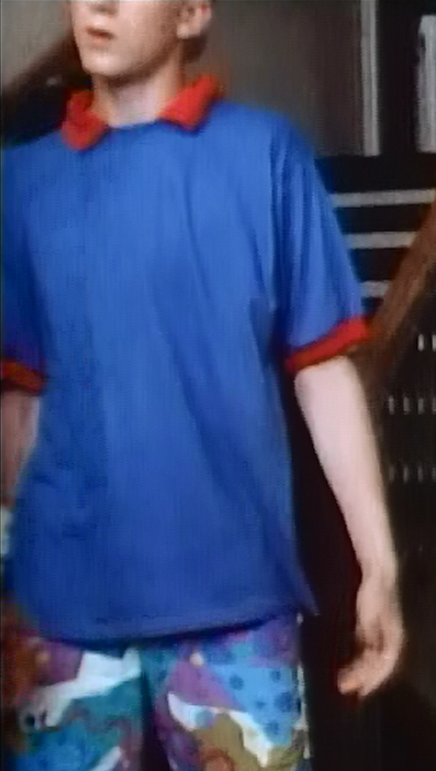 Snake starts us off with a typical Snake ensemble of his blue jacket, his dog t-shirt, and his crazy orange shorts. Next, for a brief moment we see him in that rad laid-back cool-dude tie dye with some khaki. And finally, for the Bowl-A-Thon, he stepped his game up a bit, wearing this farm animal button down TUCKED IN to some belted khakis. But to let us know he’s not too serious, he leaves his collar all crunchy.