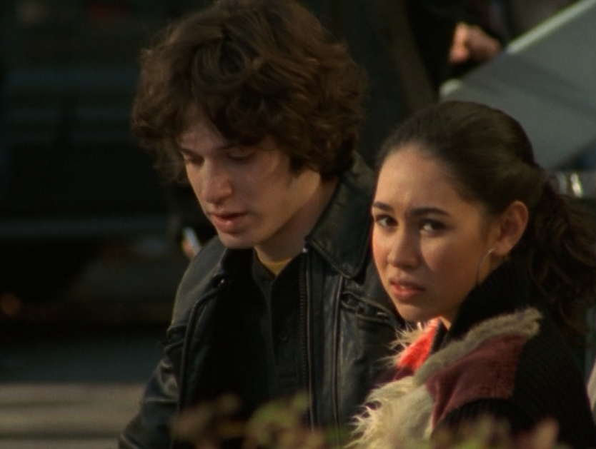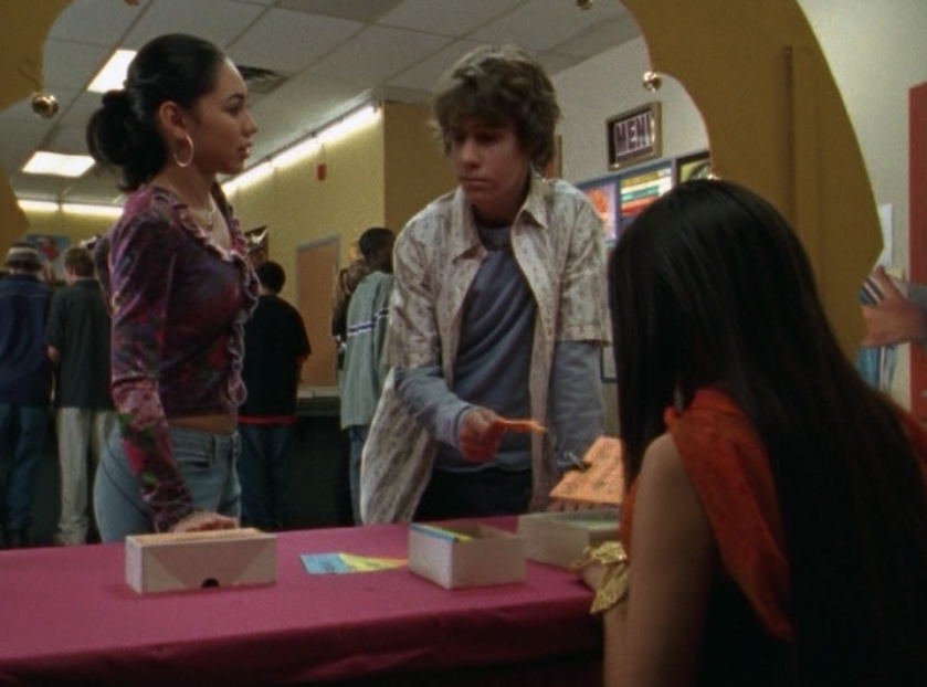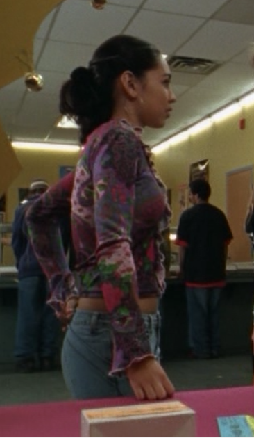 This is just downtrodden Manny being constantly pursued by and disappointed in JT. It’s kinda sad that we don’t actually get to SEE if anyone is harassing her about her pregnancy or subsequent abortion. This was to coddle the US audience I’m sure, but I wonder if anyone really would have bullied or shamed her? What kind of things might be said in the halls? First she wears this Asian-inspired blouse with a zip-up short sleeve hoodie which is kinda hilarious but also really realistic in that our outfits back then really weren’t very put-together. Next she’s seen in like a racing jacket of some kind. The next shirt is a floral ruffly bell sleeve blouse which is super cute. And finally, the famous patchwork fur jacket with casual khakis. Manny wears her hair in a resigned low bun throughout, symbolizing her shame and penance.