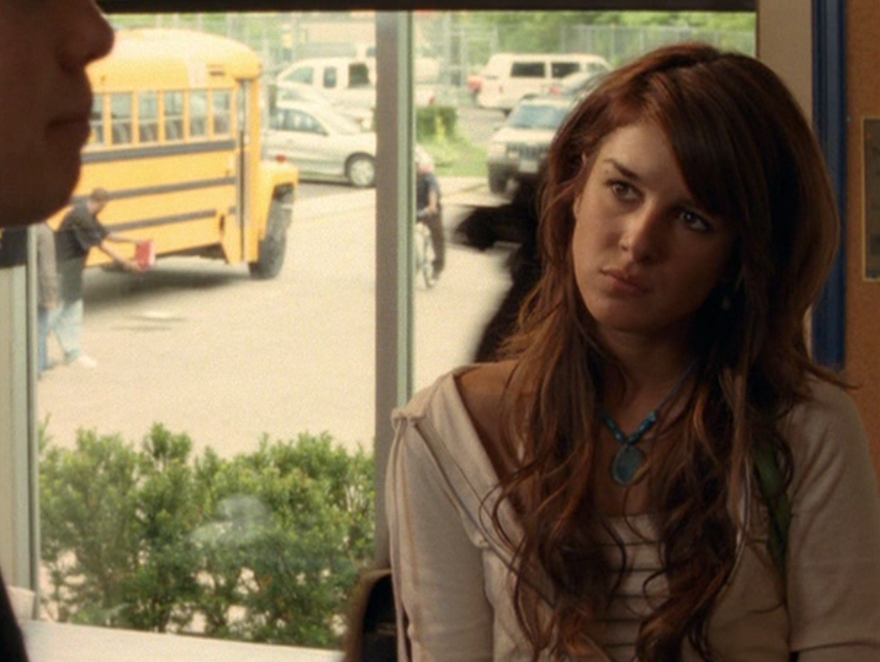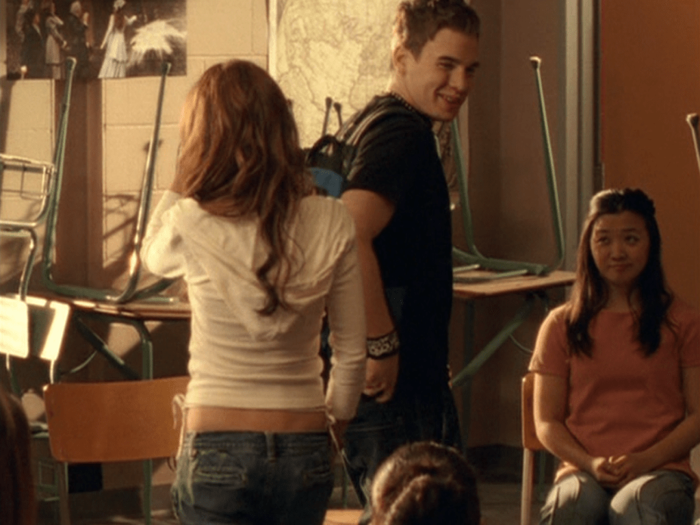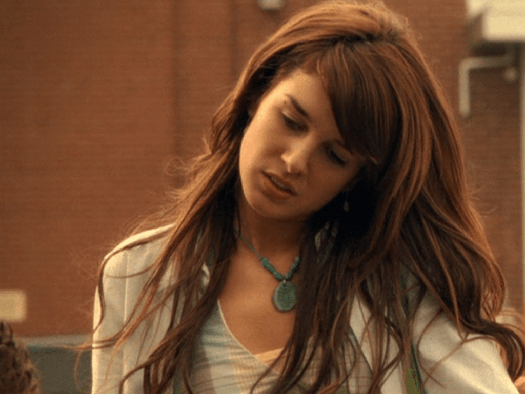 Next, for her impromptu audition with a talent agent, she wears gold wedges, a yellow ruffled mini skirt, and a matching tiny vest over what seems to be a bandeau. I mean, she really went all out for this look. Those tiny vests were SUCH a thing, I hope more of these show up as we go along. But the talent agent just let her have it. Then, we have a moment with this flip phone before we are back at school. I’m counting old tech as fashion. Manny is wearing her very famous stretchy orange halter under a weird green and orange zip up hoodie. Damn that hair is flouncy! She ties the hoodie around her waist to get verbally abused by her parents… before she goes to a rock-bottom party… where… well, you know what happens.