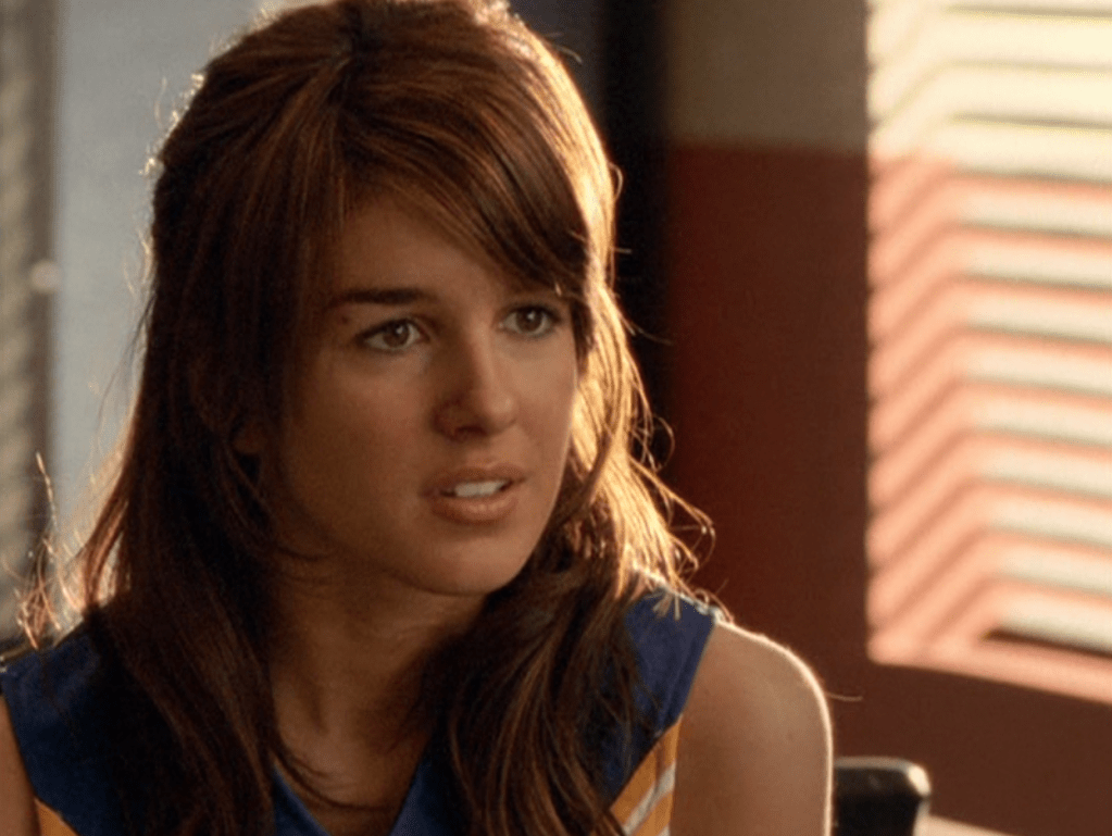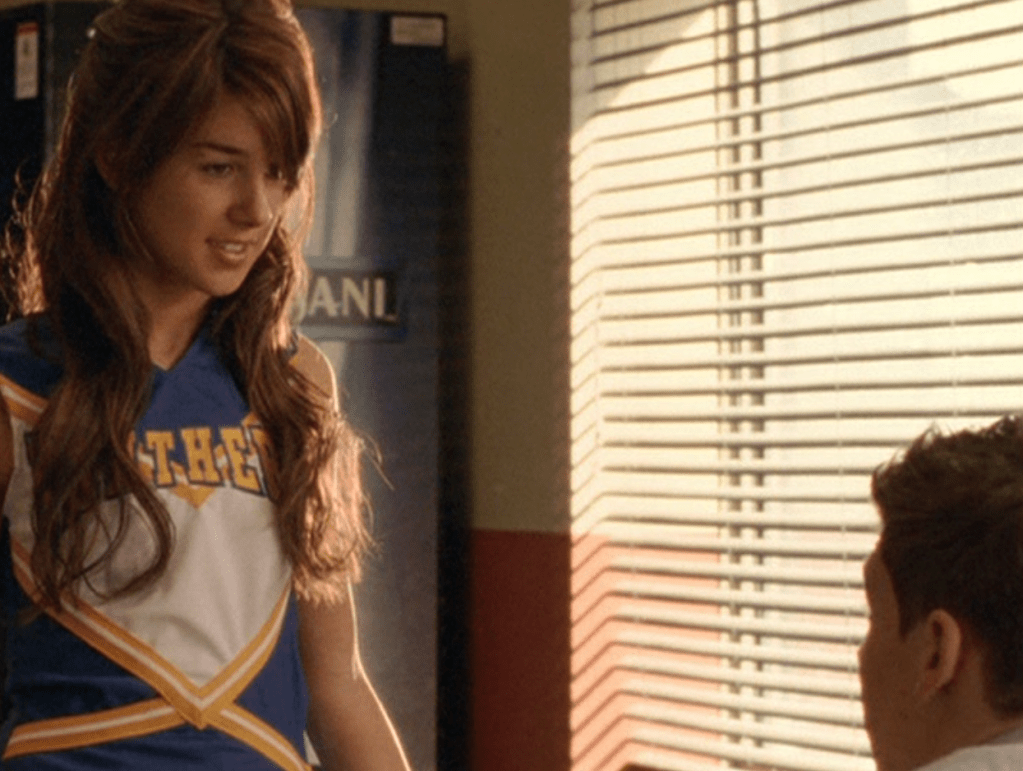 This is an interesting little episode, where Paige really starts to wear Manny down, making her life miserable. Manny tries her best to fight back but I think Paige holds more power here. I wish this saga could have been drug out a little bit. Oh well! First Manny is seen in Spirit Squad practice. Then she’s wearing a matchy-matchy velour set over a tube top with those square hoop earrings. And that pink plastic watch still, lol. She’s also still wearing her VEGAS necklace, which I still love. And unfortunately she has picked the same dress as Paige for the dance. I love it – pink, ruched, and super ruffly strapless with a dropped waist. However, the length of the dress is kinda weird, cutting off at like mid-calf, which doesn’t seem like something someone would wear during this period. Next we return to school and see the Spirit Squad uniform on her, and later those famous low-rise jeans paired with a red athletic-inspired top. Her hair looks amazing here btw. Next… Manny is being tortured in the mascot outfit. And then she returns to the dress store – I guess Paige chased her out last time – and tries on a funeral ensemble. Ultimately, though, she decides on the pink because she broke Paige’s leg and decided she deserved a treat. That’s where you can see the odd length of the dress – it kinda makes her legs look ultra-short. The shoes are odd too, like, kitten pumps. Aaand, uh oh – Paige shows up at the dance, and they have the same dress! So, Paige rips Manny’s off, and here is her underwear. Never seen a teenage girl wear underwear like this before. Finally, she’s in the locker room in a hoodie. We don’t really see Manny in hoodies, do we?