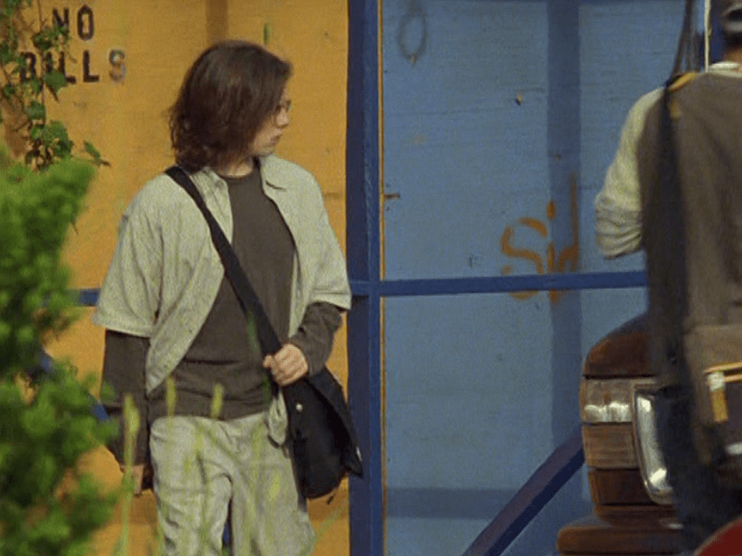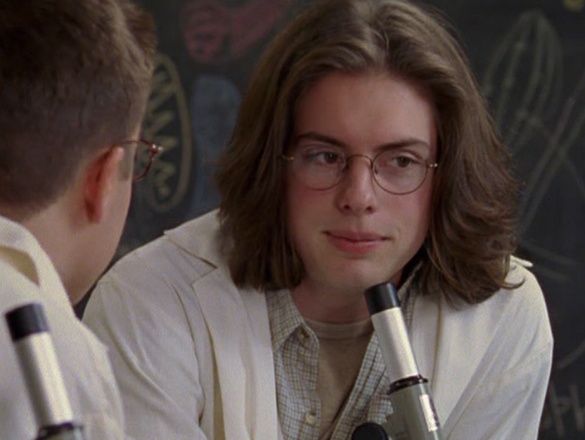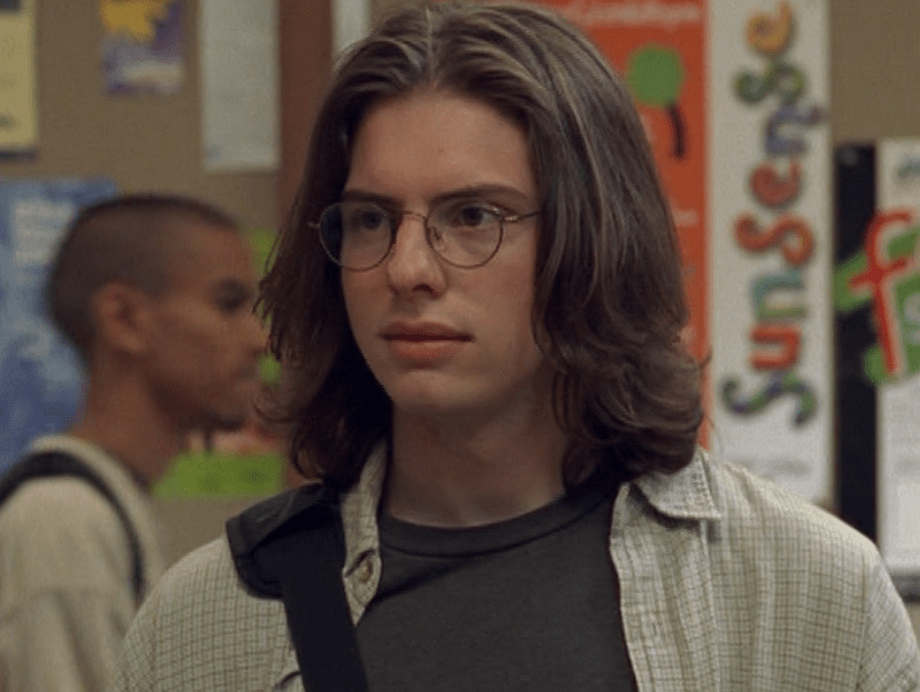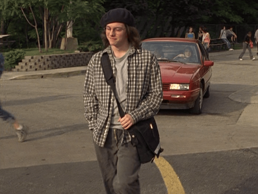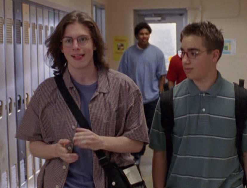 Oh man, it’s time for Marco’s moment. First he’s in a zip up jacket, hoodie, and some kind of like comic book shirt. Also shout out the soul patch, don’t know if I’ve ever mentioned it before, but there it is, looking itchy. Next Marco is in just a standard graphic tee with something random & unrelated on it, and I like his hair like this – curly and tucked behind the ears. He’s also seen helping with the blood drive in casual khakis and this red blood vest. Oh yeah, he’s being told he can’t give blood because he’s gay. Yeesh. Next, the outfit continues on, and we’re in Dylan’s dorm. Here we can see that these casual khakis are also FLARED! Shoutout to Marco’s flares, I feel like no one ever mentions them but I am such a fan of men in flares. I was hoping it would come back big time for men when flares circled around in the late 90s/2000s, but sadly it was mostly girls wearing them. Marco also seems to have this decorative belt on his waist, and lugs around a messenger bag. And he freakin walks in on Dylan with another guy. And Dylan’s like, “Oh hey Marco!” Brutal. Marco tries his best to suck it up, so he appears at the dorm party in an orange sleeveless tee with flare jeans. Oh yeah and plants a smooch on Craig. Our last look is Marco in a dark long sleeve, with hair hair still big.