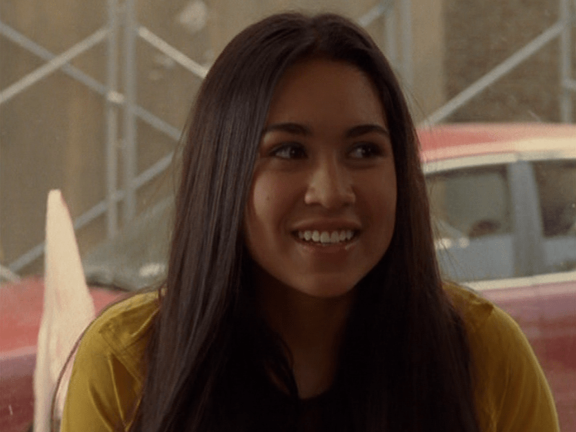I LOVE Manny in yellow! It’s a shame we don’t get to see that more. She wears this all yellow tracksuit, dangerously low rise as always, and a brown tee. Her hair is long, straight, and parted down the middle. She also sports a dark purple messenger bag. It’s a shame no one else wears these 2000s track suits on Degrassi! But, I didn’t have one, that’s for sure. They were kind of an edgy thing to wear, tbh.