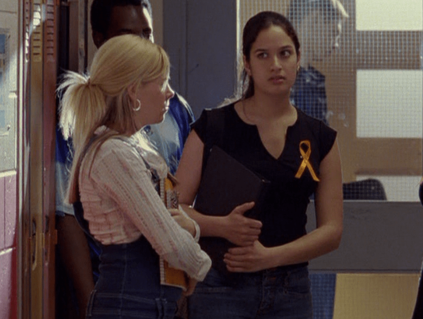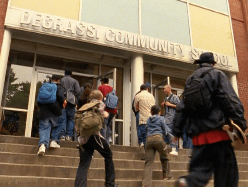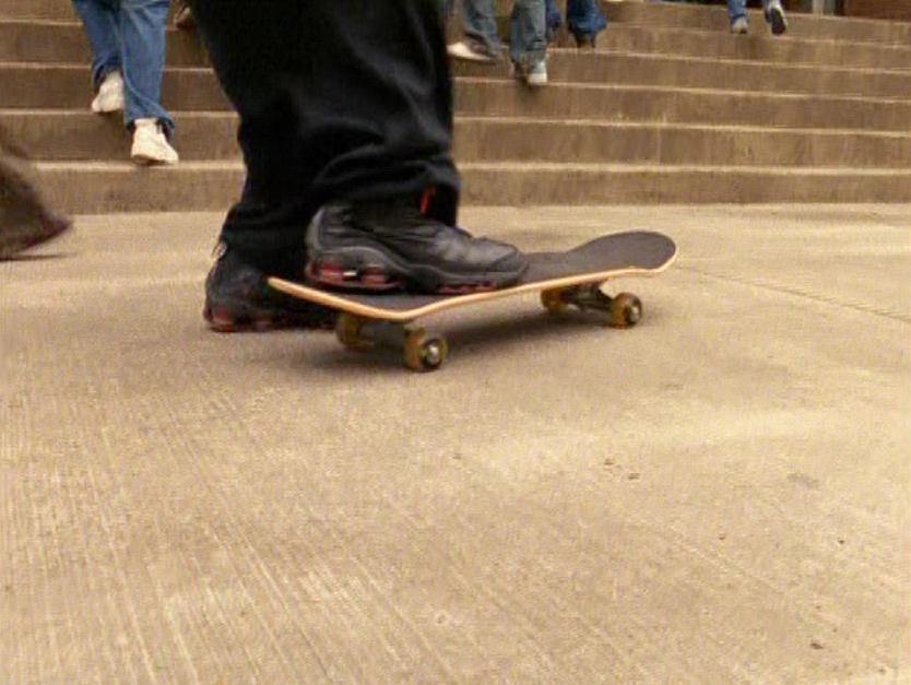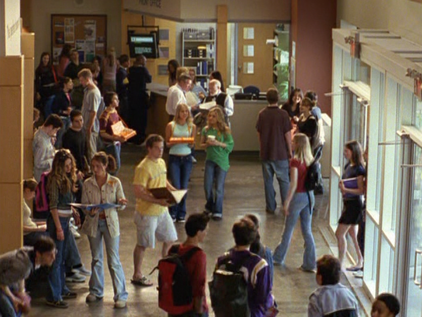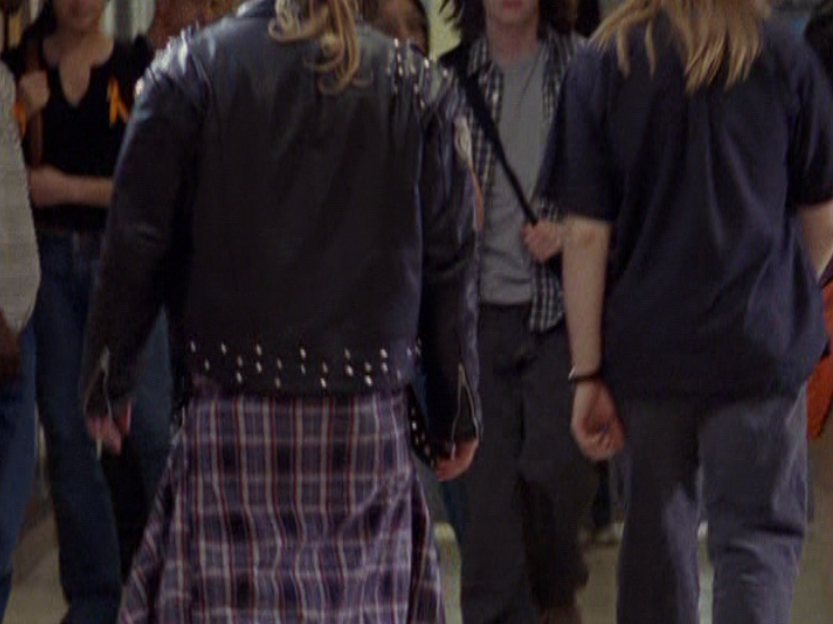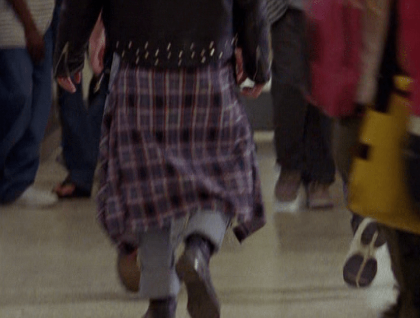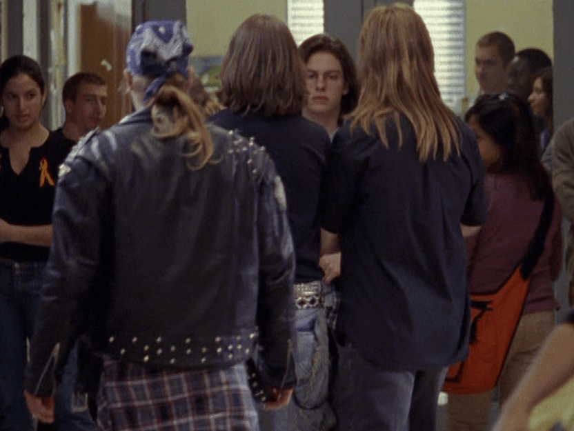 Time for the Rando Roundup as I used to call it! First we see a skateboarder in baggy jeans, not wearing skate shoes. Next a couple of group shots featuring wide leg and flared pants, chunky shoes, mini backpacks, and other recognizable fashion moments of the time. A couple of girls glaring.. more girls glaring, in cross-body bags and crossed arms.. And this “You + Me = Destiny” guy, the ever-faithful extra, wearing a 90s reminiscent ‘fit of a studded leather jacket and a flannel around the waist. Also with boots and a bandanna. This dude is often seen with the mullet guy so I did add in a quick shot of the mullet guy as well.