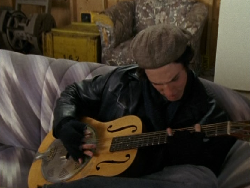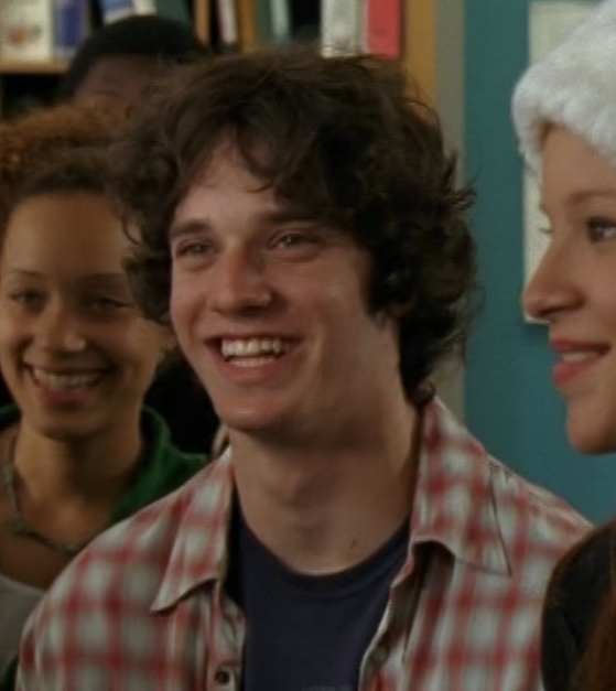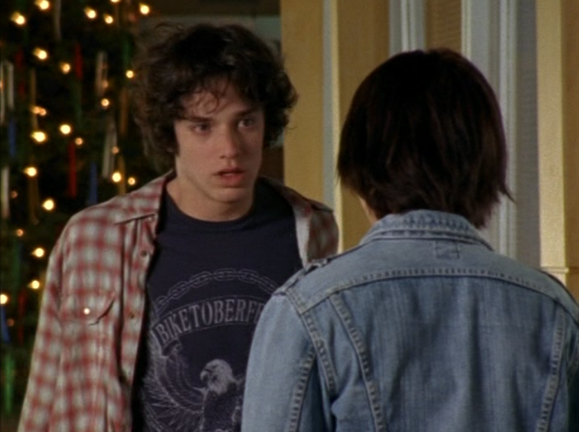 I did a poll on whether this stupid hat with the stupid bangs tucked in was one of the worst fashion choices in Degrassi history, but a lot of you did not agree. Oh well, I still stand by my opinion that this hat is a big NO. And apparently Craig didn’t like it either because we never see him wear this again. So first he’s all cocky in the mall in that hat and a leather jacket. Then he’s playing guitar in fingerless gloves. At school he wears an Oktoberfest tee and a flannel. And unfortunately he puts the hat back on for our final shot.