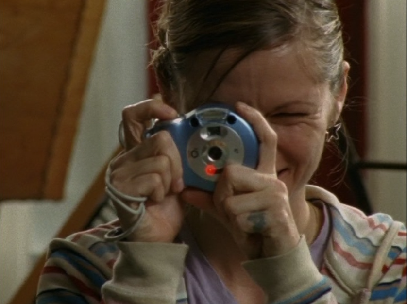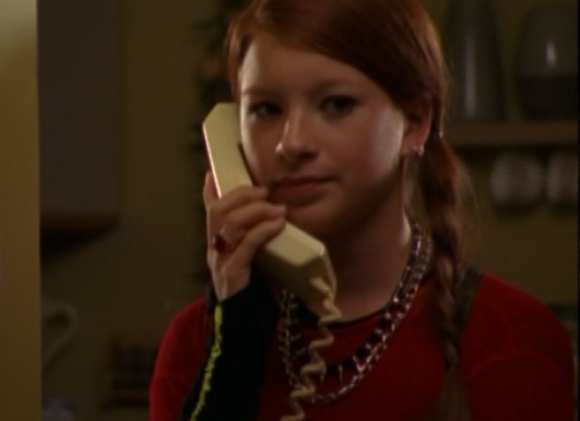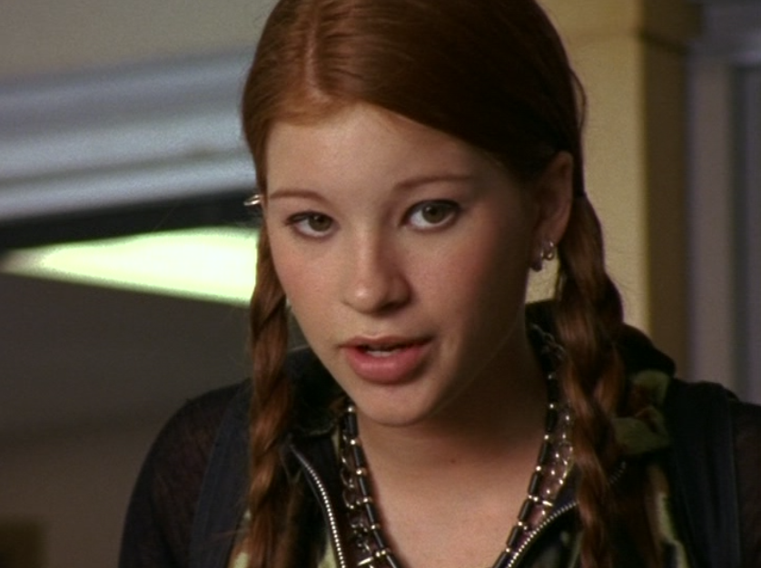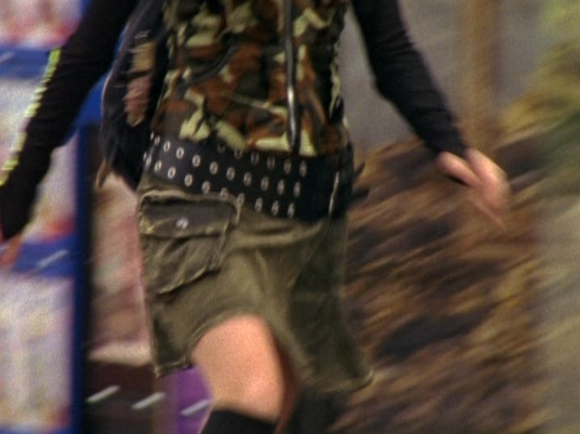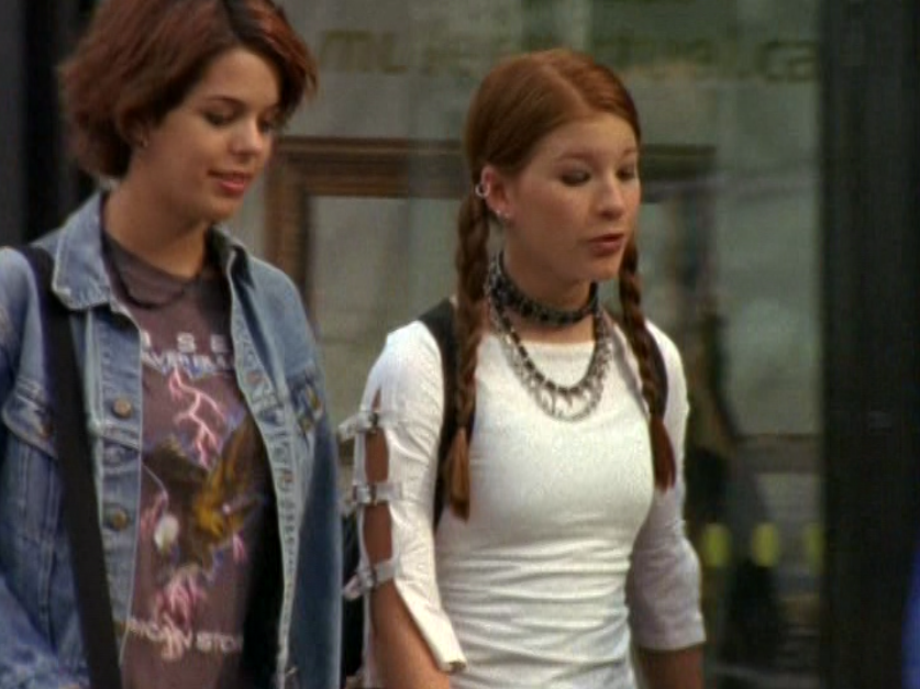 Next up, is an Ellie ‘fit for the ages. The white 3/4 sleeve tee with splits and buckle detailing. This is 100% something I would have worn, not that anyone’s asking. She accessorizes with spiky, chainy, chokery necklaces. She wears a red plaid pleated skirt that has some kind of suspender or strap hanging off. We also have fishnets and these amazing chunky wedge boots. It’s an amazing look and a real shame that Paige spilt something on it. She dons a big yellow raincoat for her interview with Caitlin.