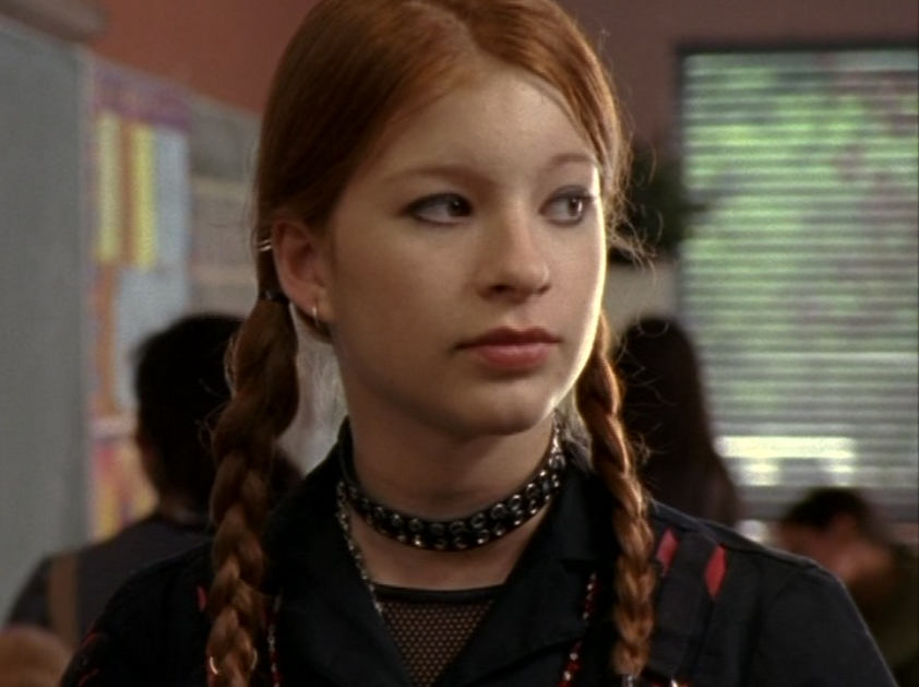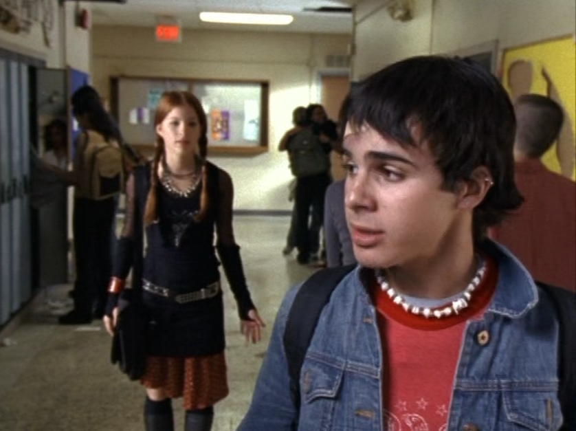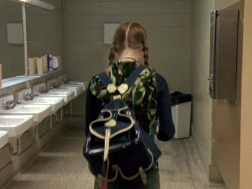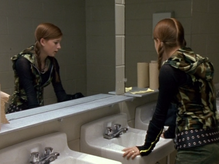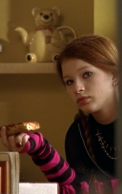 Next, that white and bloody shirt over a black long sleeve with exposed seams of green. And then… AAAAH the red and black stripes, just soooo 2000s mall goth and I am living. We see a couple more outfits very briefly just to show that time is passing. So let’s skip ahead to…