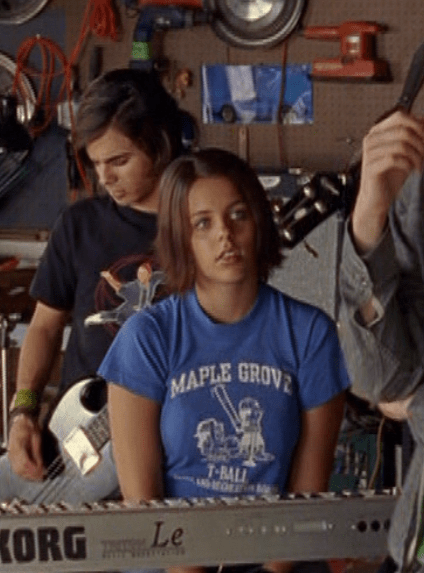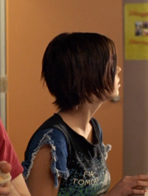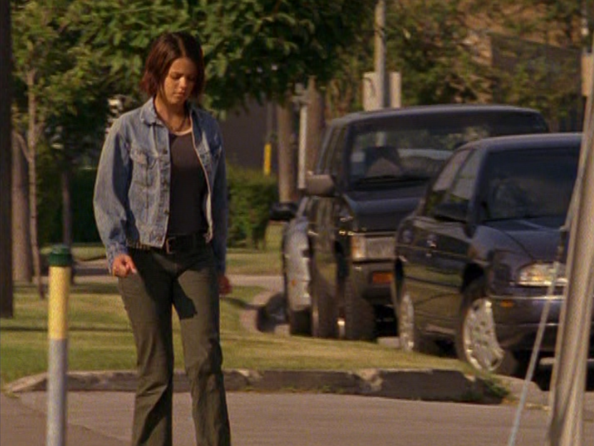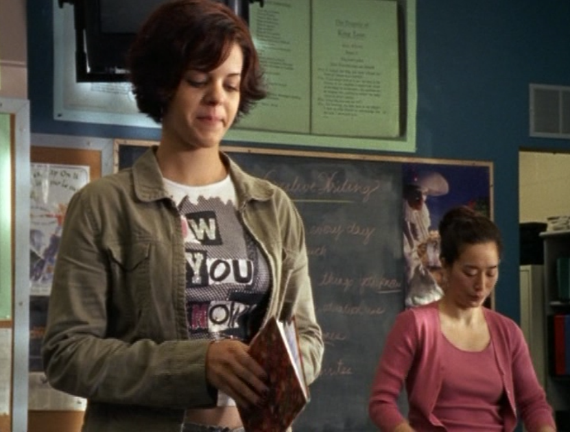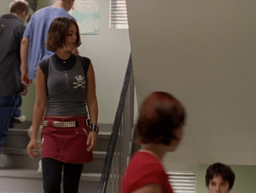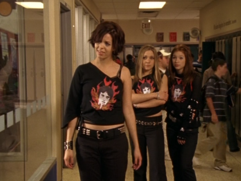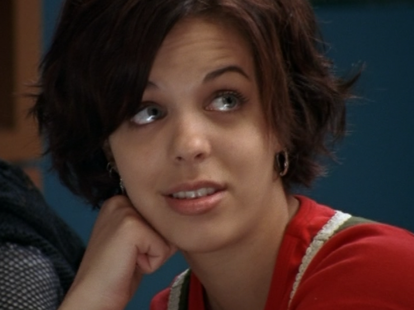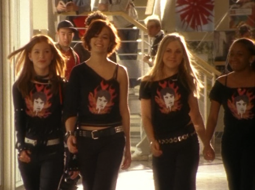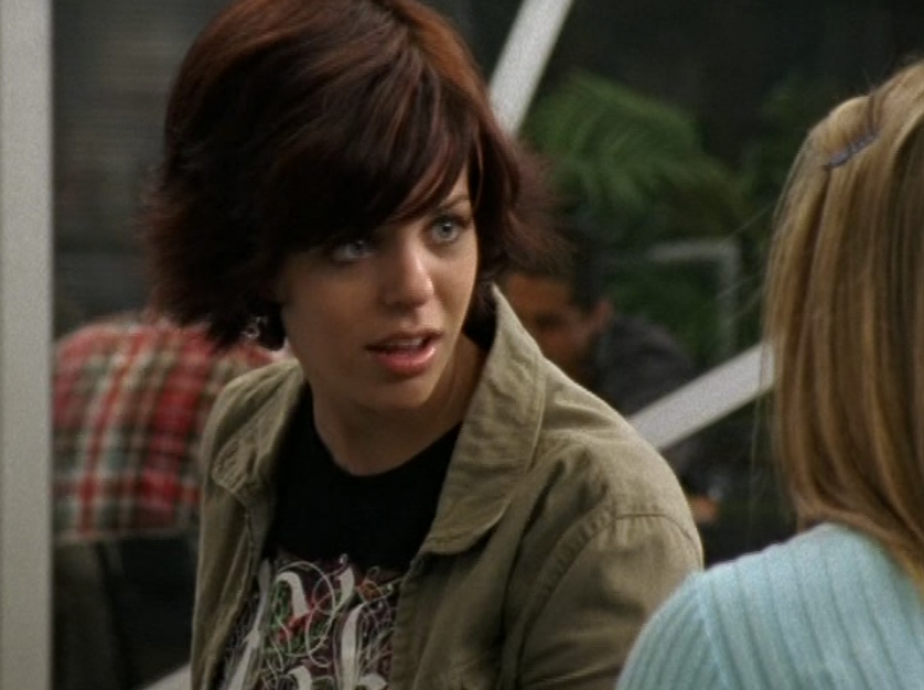 Anyway, so her hair loves the curling wand now. And her clothes are still pretty cool but she’s definitely devolving. lol. First she wears her Emily the Strange bag with a long sleeve shirt under a short sleeve shirt and her go-to o-ring necklace. She takes Jimmy to the museum in a leather jacket, studded belt, and these flare jeans that are freaking cuffed like 6 inches. She and Paige both. How short ARE these people?! I had to buy long length jeans back then. She’s seen briefly looking cute in maroon, and finally in some graphic tee, giving Jimmy a LEADING smile.