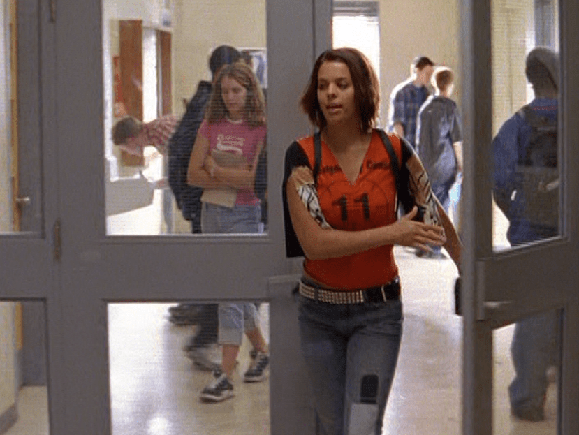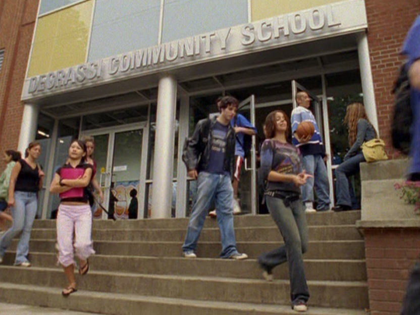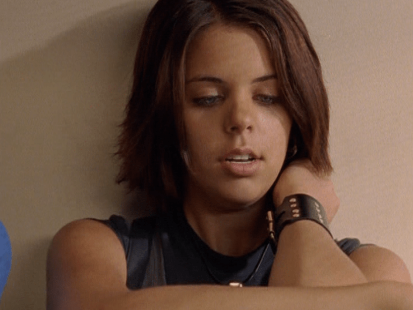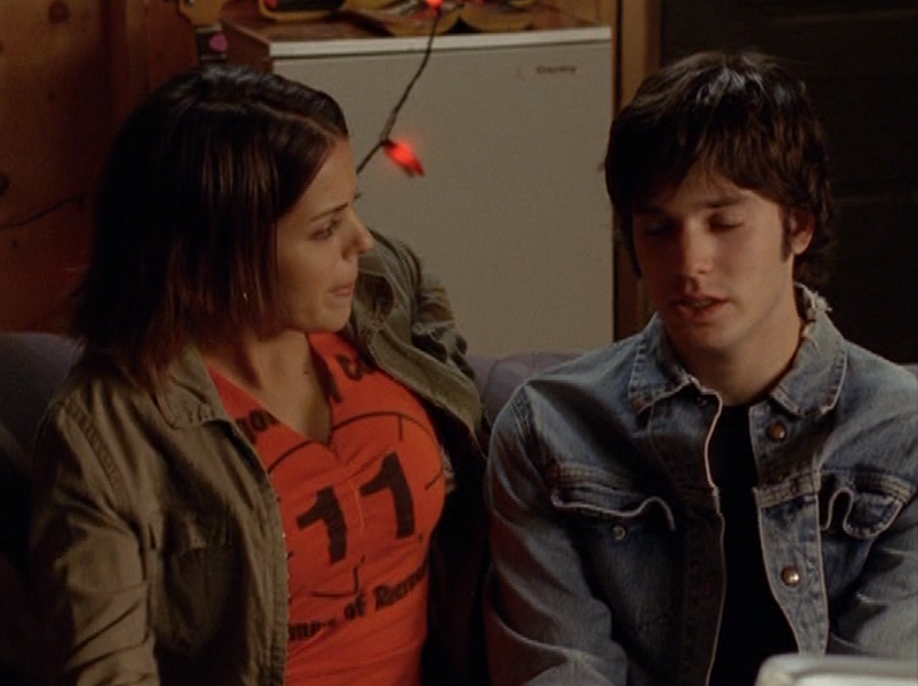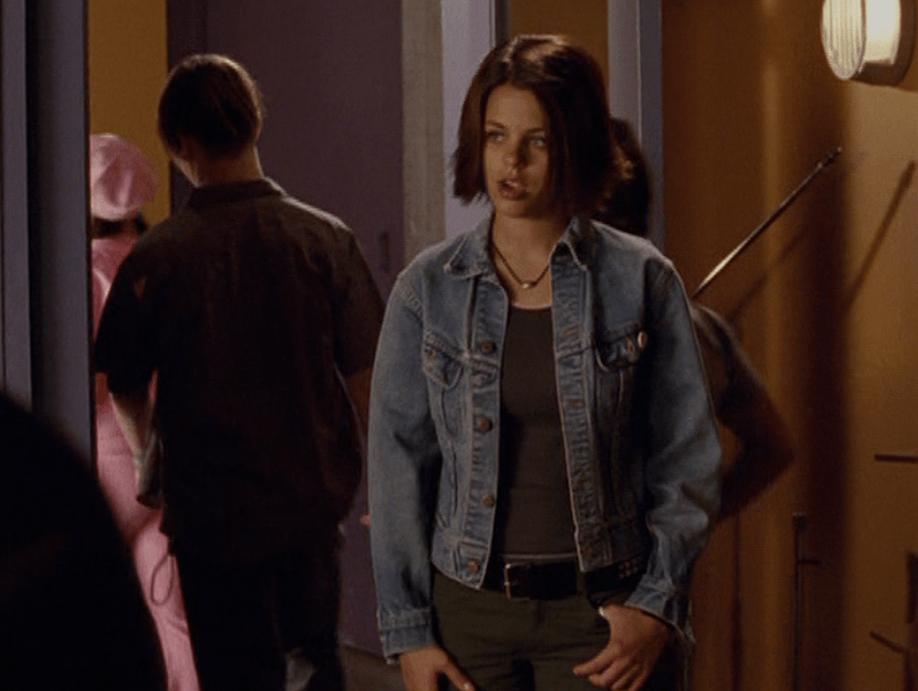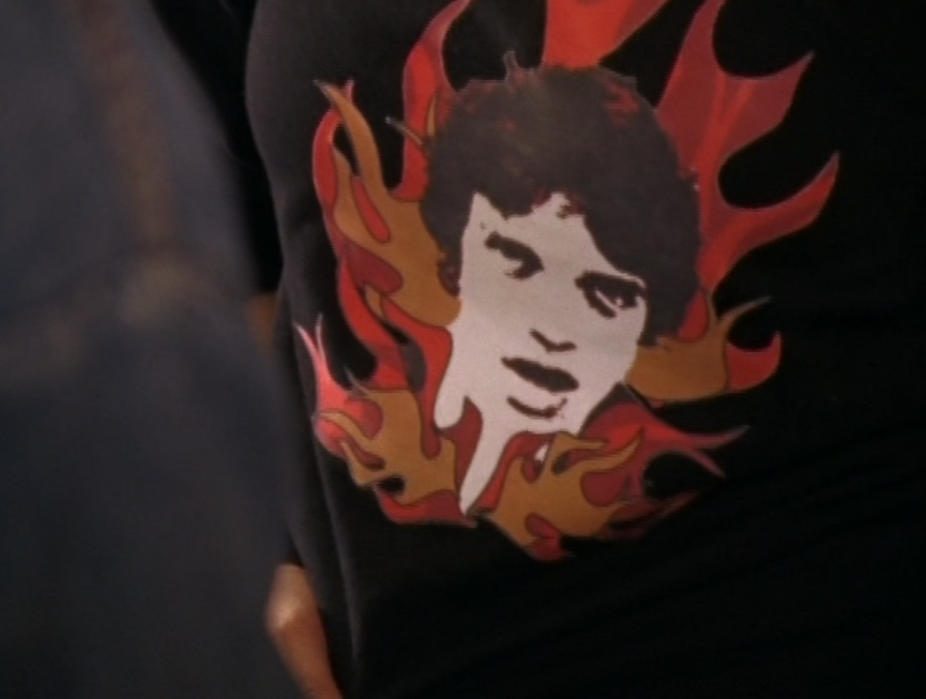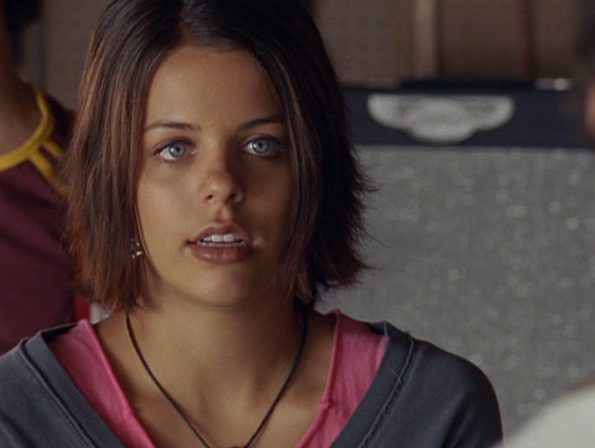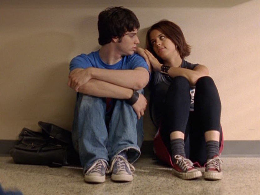 Anyway, so her hair loves the curling wand now. And her clothes are still pretty cool but she’s definitely devolving. lol. First she wears her Emily the Strange bag with a long sleeve shirt under a short sleeve shirt and her go-to o-ring necklace. She takes Jimmy to the museum in a leather jacket, studded belt, and these flare jeans that are freaking cuffed like 6 inches. She and Paige both. How short ARE these people?! I had to buy long length jeans back then. She’s seen briefly looking cute in maroon, and finally in some graphic tee, giving Jimmy a LEADING smile.