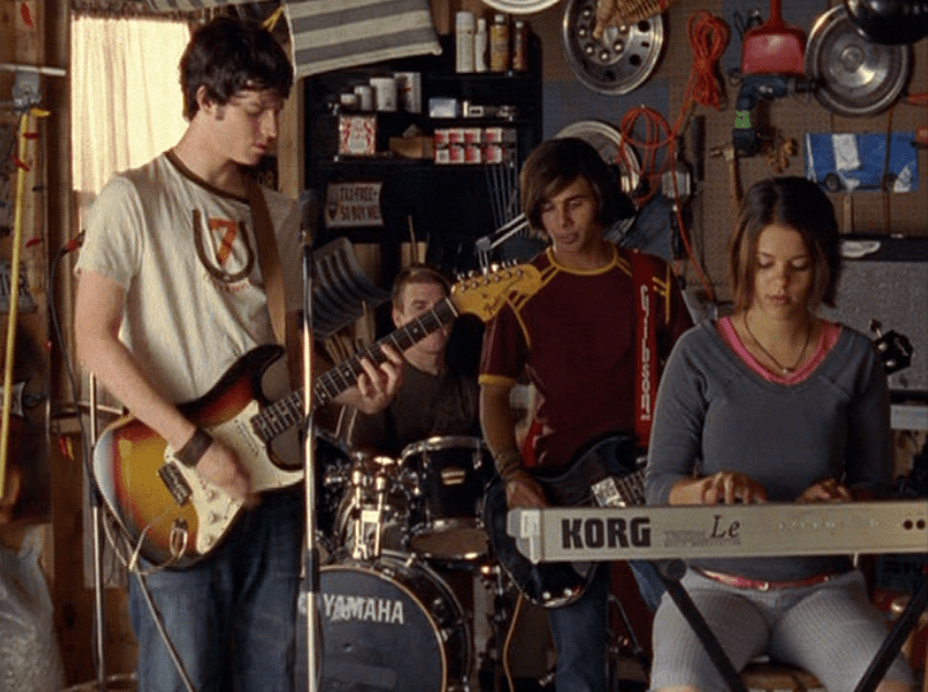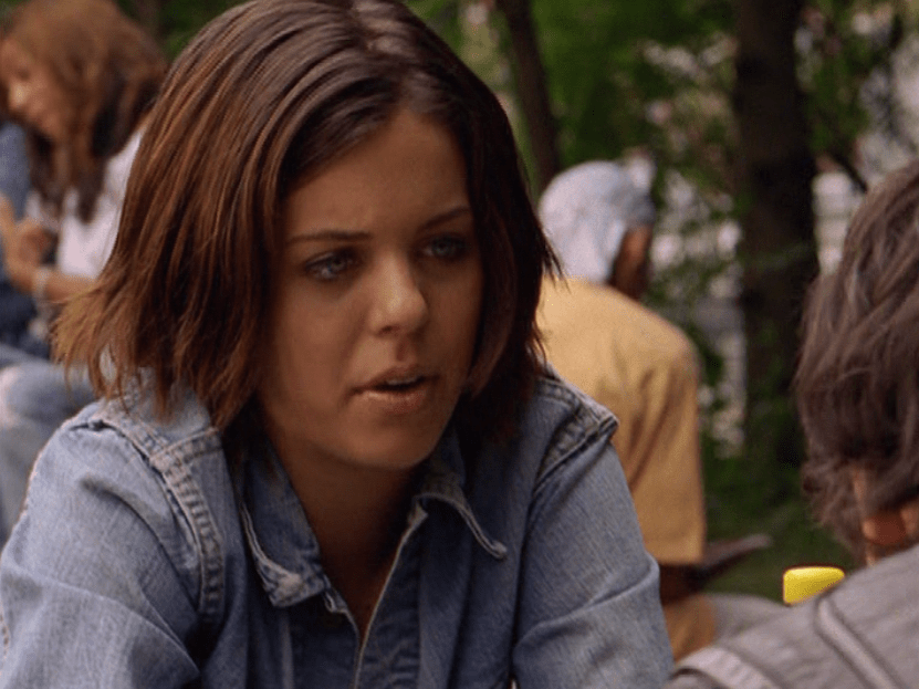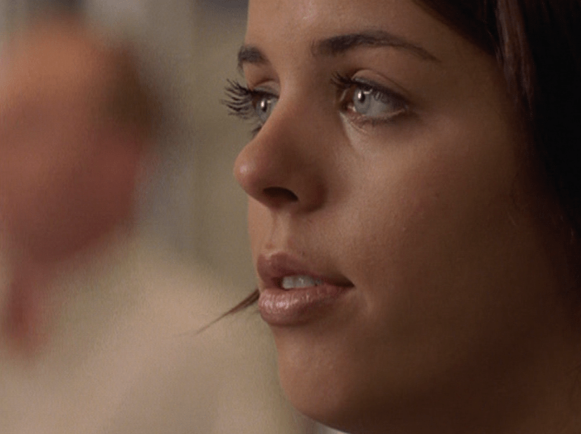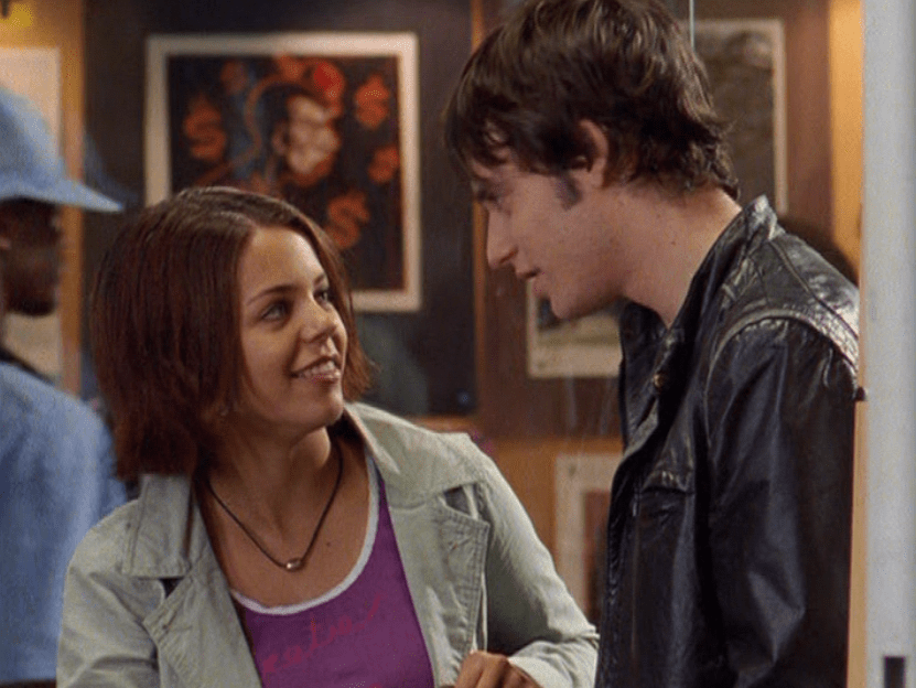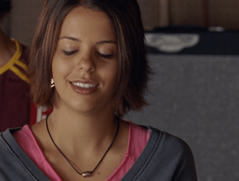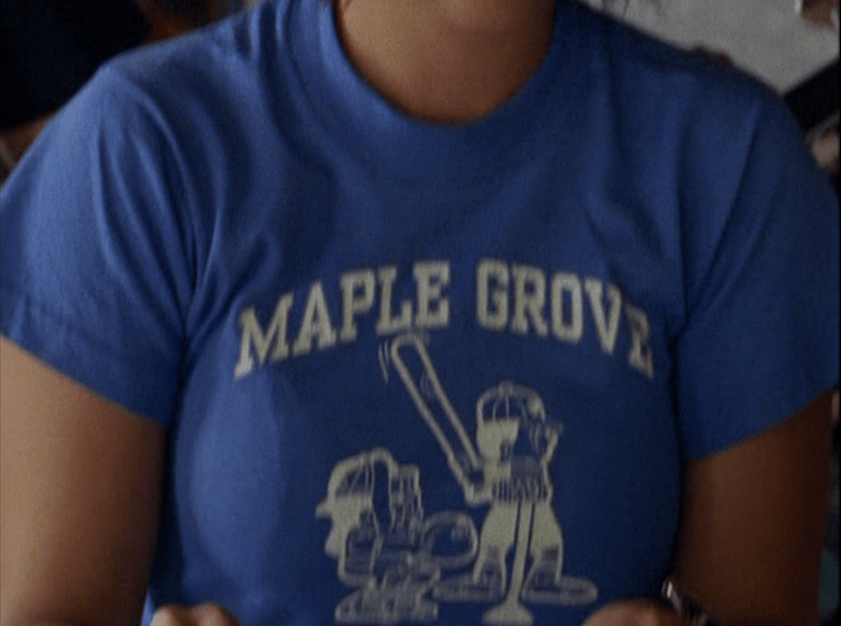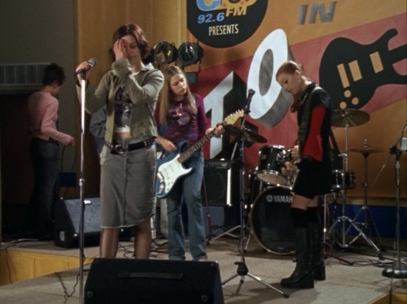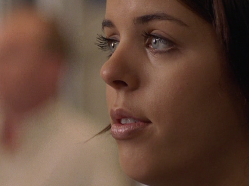 Anyway, so her hair loves the curling wand now. And her clothes are still pretty cool but she’s definitely devolving. lol. First she wears her Emily the Strange bag with a long sleeve shirt under a short sleeve shirt and her go-to o-ring necklace. She takes Jimmy to the museum in a leather jacket, studded belt, and these flare jeans that are freaking cuffed like 6 inches. She and Paige both. How short ARE these people?! I had to buy long length jeans back then. She’s seen briefly looking cute in maroon, and finally in some graphic tee, giving Jimmy a LEADING smile.