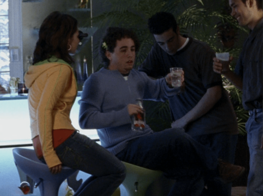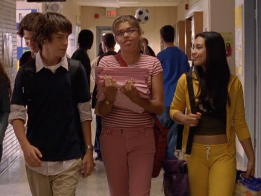 Back at school, we see an assortment of cross-body bags and messenger bags. At the hot-girls-only party, Tankini Tramp Sara Paxton is apparently friends with Emma now, and her bra straps are hangin out – a favorite look! And finally.. the vodka guy is kinda gross, isn’t he?