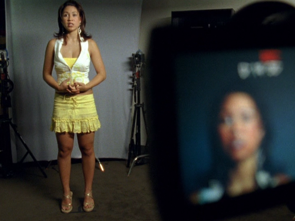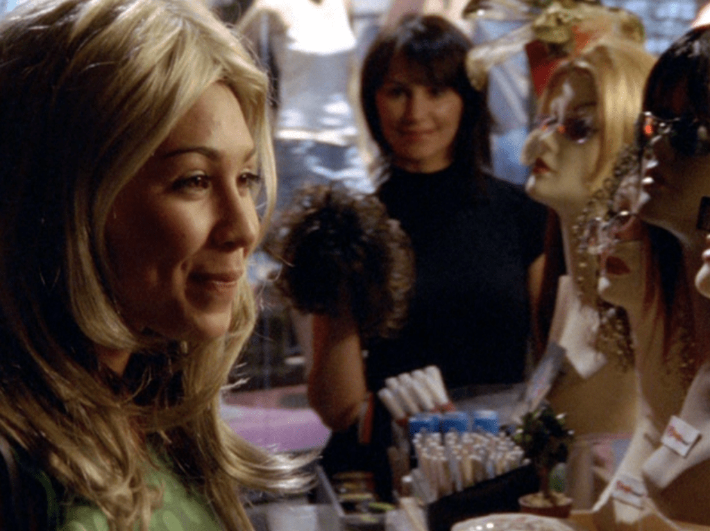 I had to include this mannequin shot because you can see the low-riseness of the pants, the tightness of the shirt, and that grommet belt, oof. Also at the mall, Manny is looking at this girl wearing a low-rise mini skirt, and the girl is also wearing the wig that Manny tries on… yeaaaah y’all can’t get anything past me!! I’m onto your secrets! Also at the mall is this gorgeous blonde with fillers and heavy makeup, also a miniskirt. I’ve said it before and I’ll say it again, I still love and always have loved that golden Playboy blonde color that’s currently “out”. It’ll be back, just you watch.