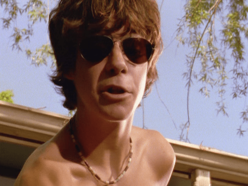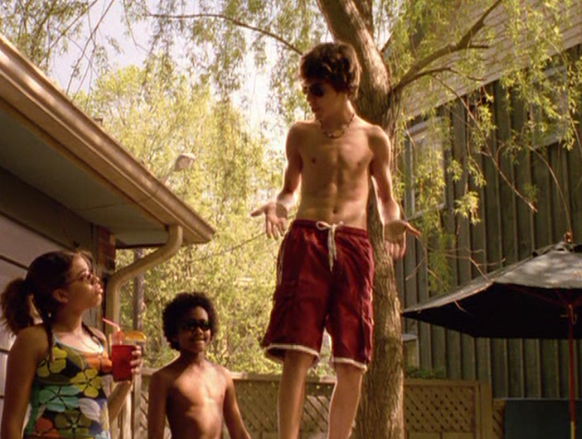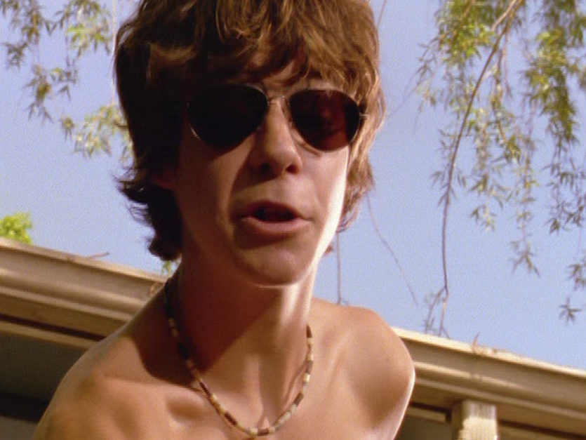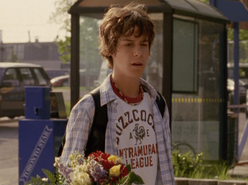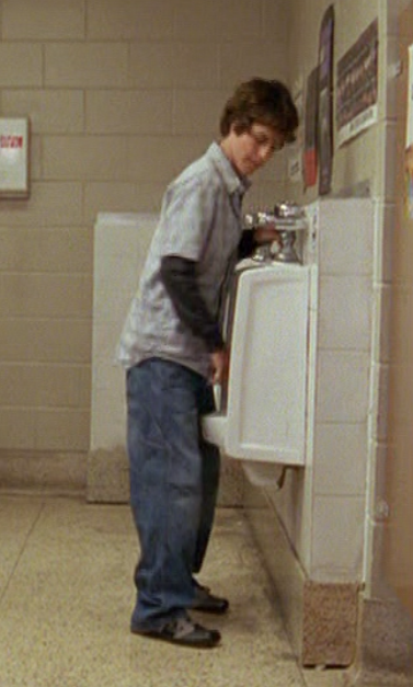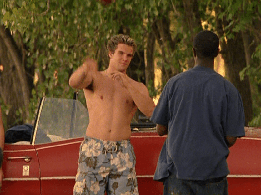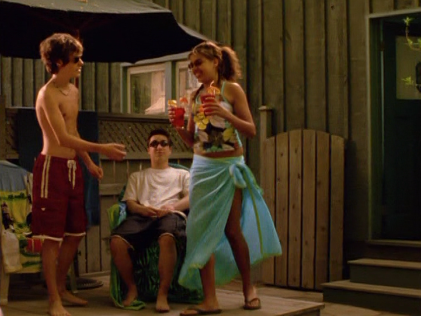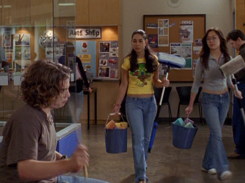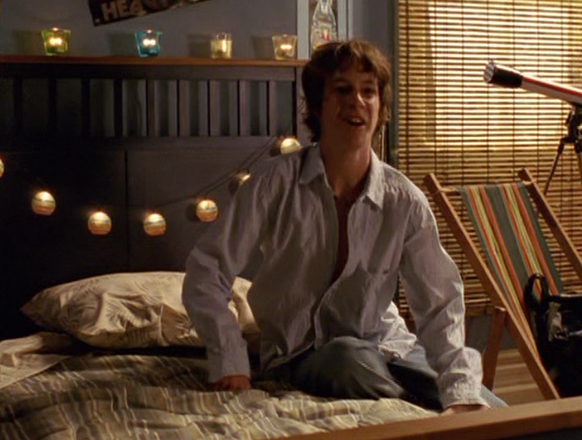 Ah yes, JT’s shining moment. I wonder if Ryan Cooley felt that the writers constantly abused JT. Anyway so he’s got a major confidence problem because everyone sees his peenie and it’s small. Gosh, at least he seems to have gotten a haircut. Anyway, first he’s in swim trunks, a necklace, and some shades. At school he’s got a really preppy look of layered collared shirts. Next, in gym, he’s talking about Craig in blue shorts and a tee. Oh and sorry to show you a picture of JT tinkling, but it’s a full outfit shot and we don’t get very many of those. Long sleeve shirts under short sleeve shirts for the win. As well as the wide leg jeans. I’ve also included a nice shot of the King Cobra Penis Pump. Ew, okay, and the lovemaking outfit in the bedroom, complete with the mustache sweat, is like the worst thing ever. It’s hilarious but also makes me feel so embarrassed for JT. He’s got this breezy buttondown halfway undone, exposing his chest. loool. And the sex thing doesn’t go well if you recall – so the next outfit is here at school and it’s just so sad, he’s got a ton of flowers to say “sorry you saw me using a strange genital contraption”, with a plaid button down over an athletic-inspired tee, and casual khakis. Ouch, it is just painful. I gotta say though I kinda like most of JT’s style this episode. I don’t love it as much as early JT, but it is super realistic for the time period.