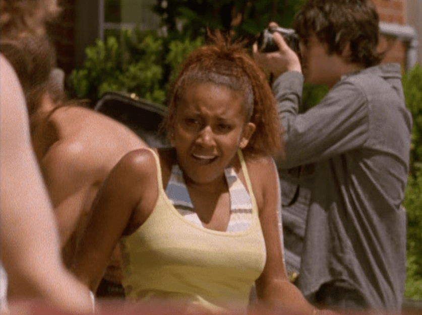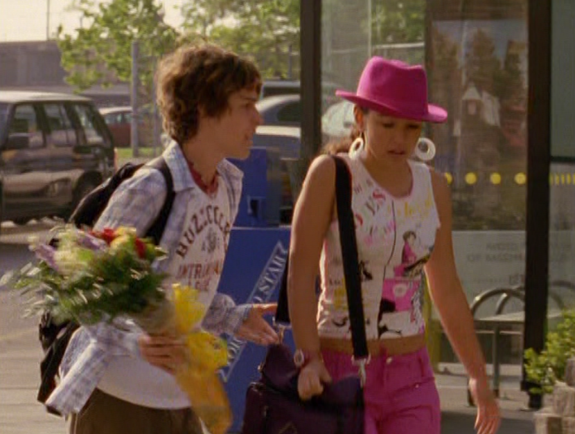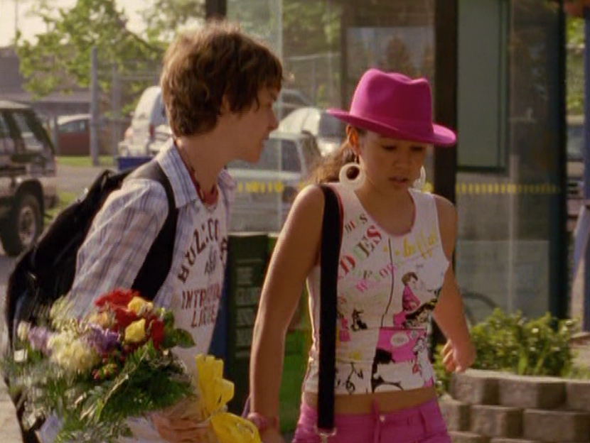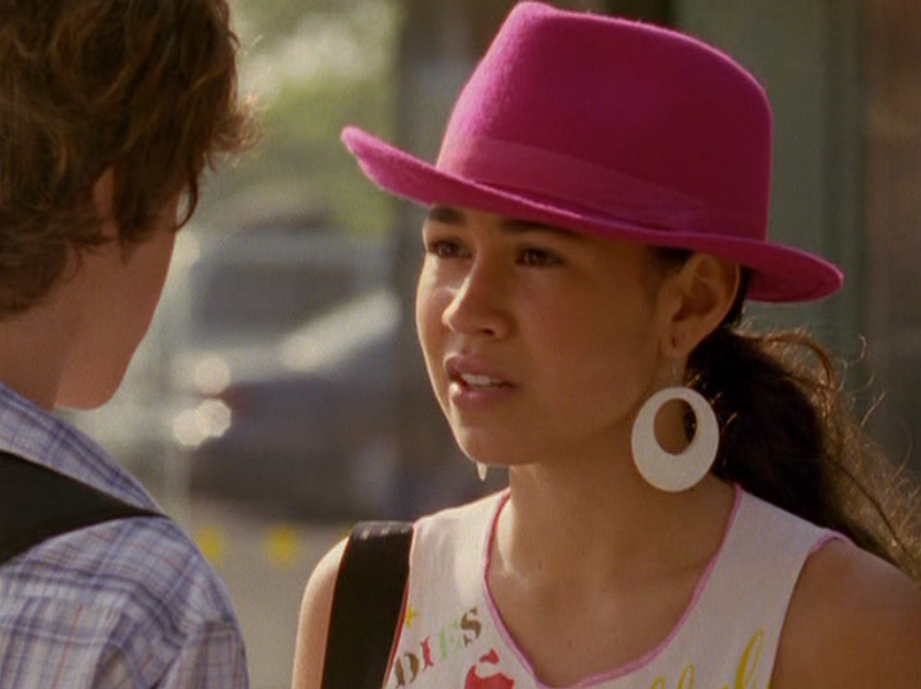 It’s Manny hour! Her hot tub vibe is sooo cute. I love the cherry bikini and those sunnies. Unfortunately her boyfriend is farting all over the place. The next outfit is kinda subdued, oversized 60s-mod-looking earrings, a zipup hoodie, and an orange tube top. Man, I kinda miss tube tops. Ones like what she’s got on with that thick elastic band at the top. Next she’s wearing her Asian looking blouse with the vertical striping and low rise jeans. She puts on a dark denim jacket to head over to JT’s house for sex. LOL! He wishes! This last outfit!! FINALLY we get some flash! She wears a PINK FEDORA which matchers her PINK PANTS! Also, a graphic tank and platform flip flops! I’m dying!
