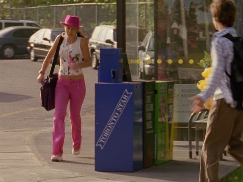 Rando time! First we have these girls who are doing a great job of pointing and staring at Sean. They must be theatre majors! Some noteable fashion moments here include that hair clip that stowawayed over from the 90s, as well as that nice cross-body bag with the cell phone pocket. Next is this weird shadowy group therapy session shot which doesn’t actually feature much fashion detail. But then we land in Wasaga Beach!! Check out this cool dude in Hawaiian swim trunks with spiked and frosted tips! The only thing we are missing is a barbed wire or belly button sun tattoo! I’ve also spotted Snooki here at Wasaga, looking like the ultimate 2000s hottie while shopping for beach towels. And finally I have a couple more shots from school again. We got a dude with super baggy pants, and a journalist in a brown suit. Aaand, two other girls probably talking about Sean. Check those highlights!