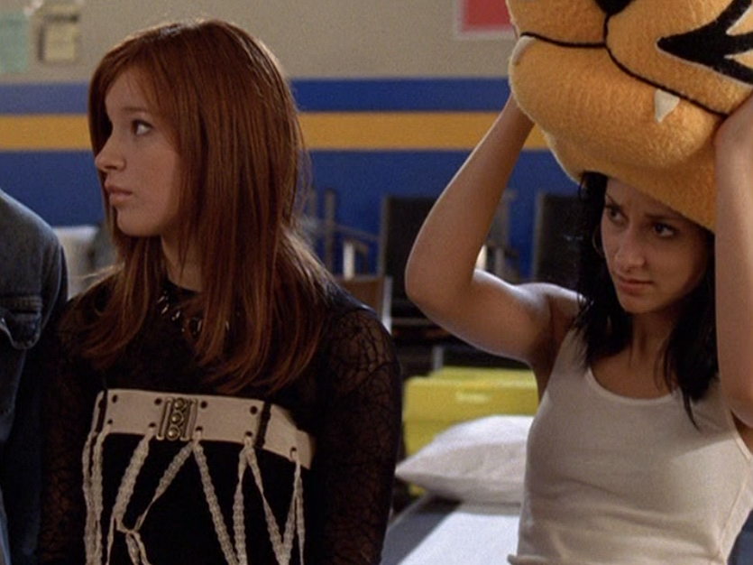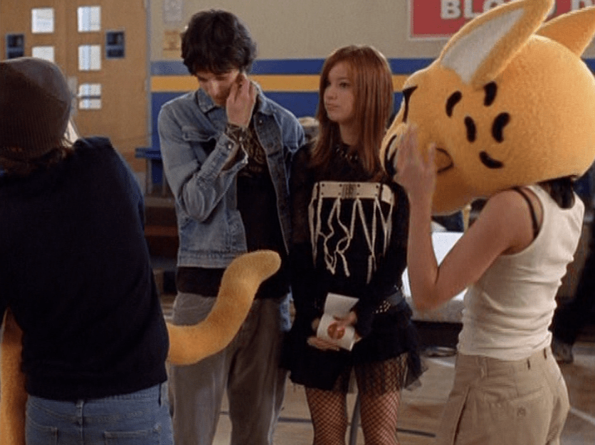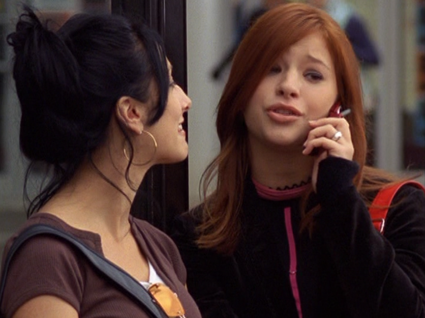 “MONOGAMY, WOW, what a concept!” Haha, it would have been funny if Ellie ended up cheating on someone one day. Oh shoot, (hah) she’s wearing the basketball hoop today! Have we covered this thing yet? This is one of the most wretched and bizarre garments of Degrassi. What is happening, and WHY?! I don’t even need to describe this to you. It’s a BASKETBALL HOOP around her torso! Anyway, sometimes I’m really buying the “goth” look on her but today she’s not selling it. Her hair looks very basic as well as her makeup, nothing to support that strange outfit. However, this second look here is super cute. A black shirt with pink detail, a side part, and a flip phone.