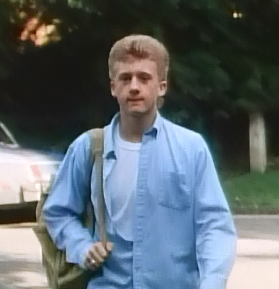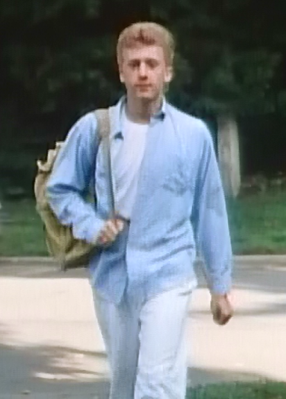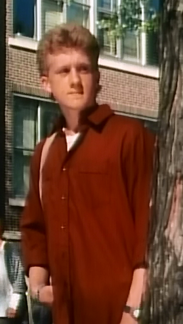 The morning after, Shane waits outside for Spike in a red-brown button down. Looks like he finally figured out how to button his shirts.