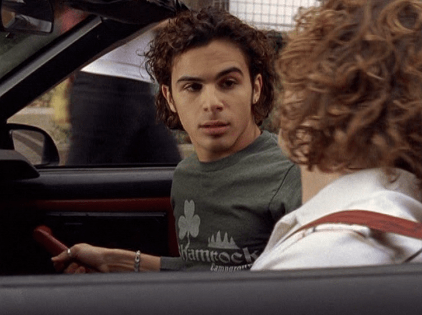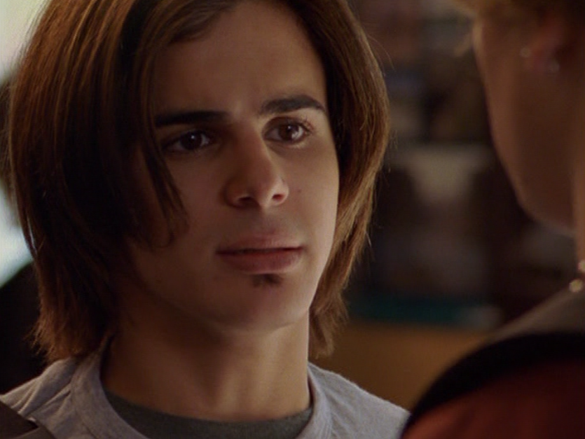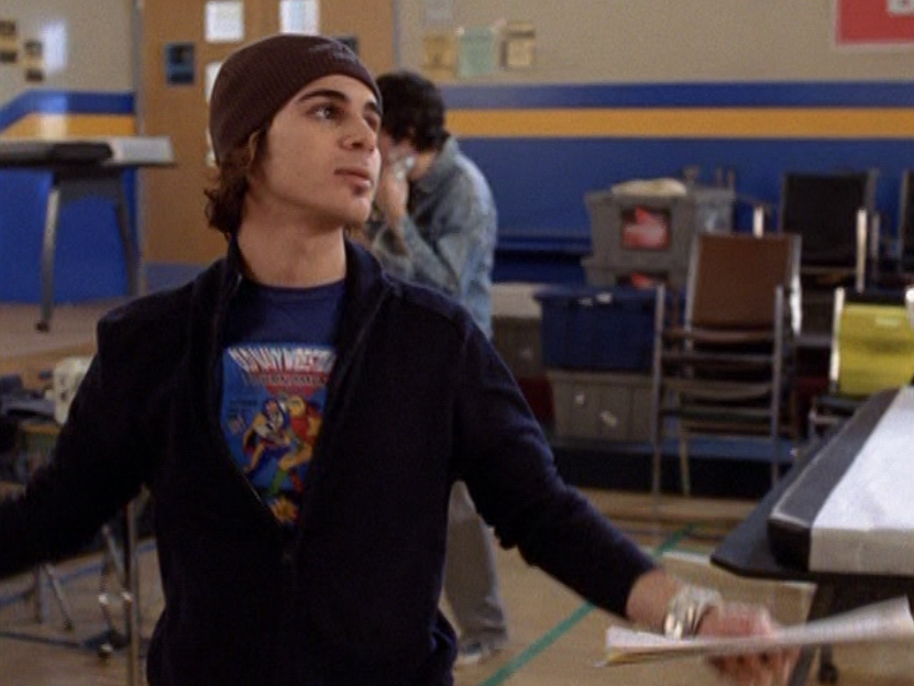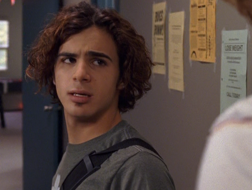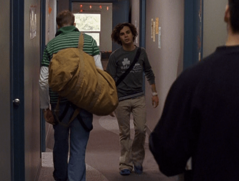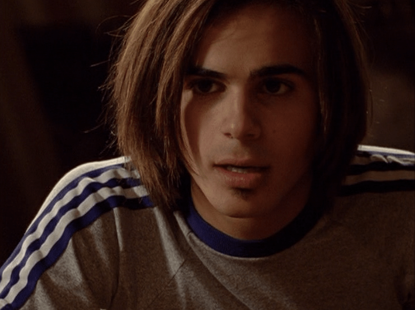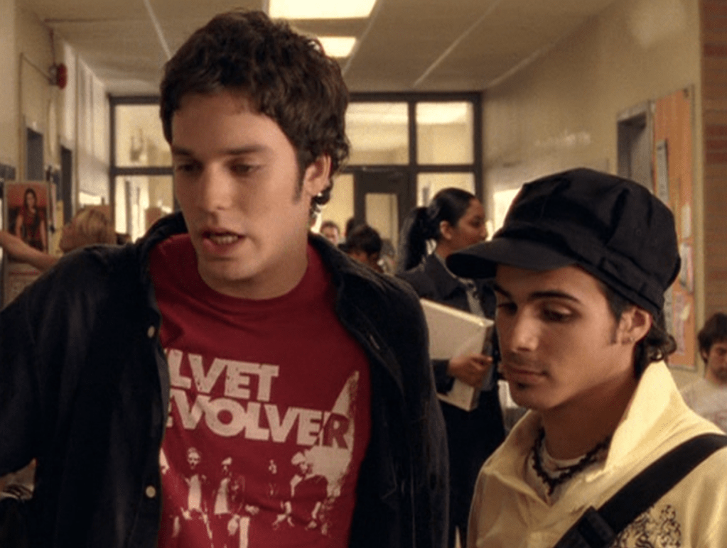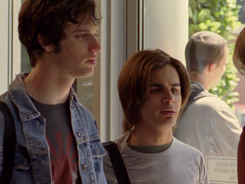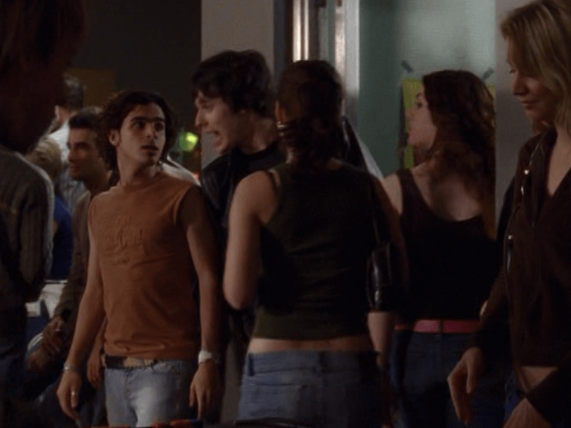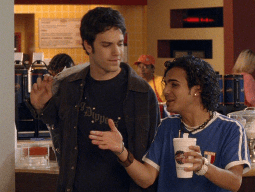 Oh man, it’s time for Marco’s moment. First he’s in a zip up jacket, hoodie, and some kind of like comic book shirt. Also shout out the soul patch, don’t know if I’ve ever mentioned it before, but there it is, looking itchy. Next Marco is in just a standard graphic tee with something random & unrelated on it, and I like his hair like this – curly and tucked behind the ears. He’s also seen helping with the blood drive in casual khakis and this red blood vest. Oh yeah, he’s being told he can’t give blood because he’s gay. Yeesh. Next, the outfit continues on, and we’re in Dylan’s dorm. Here we can see that these casual khakis are also FLARED! Shoutout to Marco’s flares, I feel like no one ever mentions them but I am such a fan of men in flares. I was hoping it would come back big time for men when flares circled around in the late 90s/2000s, but sadly it was mostly girls wearing them. Marco also seems to have this decorative belt on his waist, and lugs around a messenger bag. And he freakin walks in on Dylan with another guy. And Dylan’s like, “Oh hey Marco!” Brutal. Marco tries his best to suck it up, so he appears at the dorm party in an orange sleeveless tee with flare jeans. Oh yeah and plants a smooch on Craig. Our last look is Marco in a dark long sleeve, with hair hair still big.