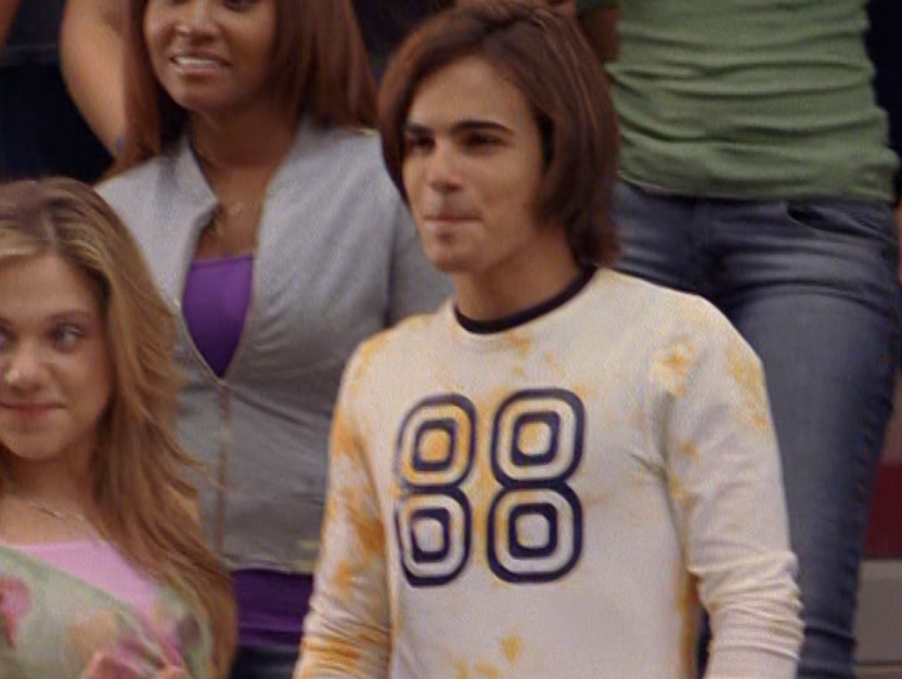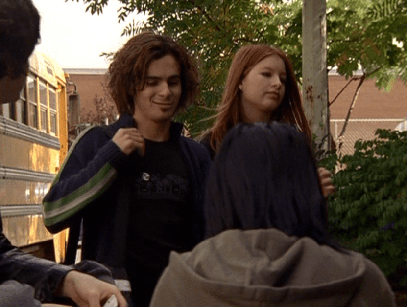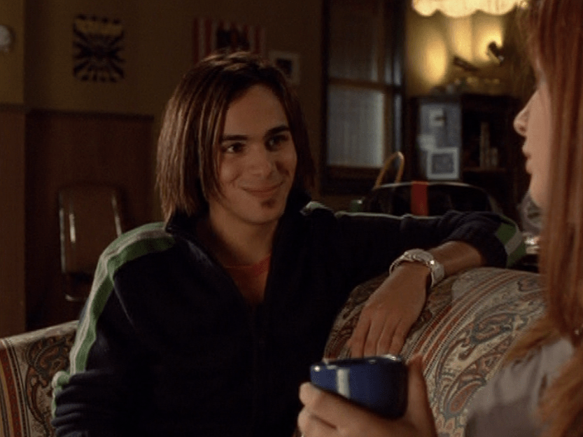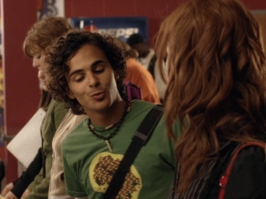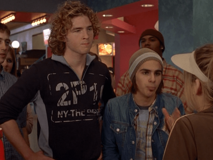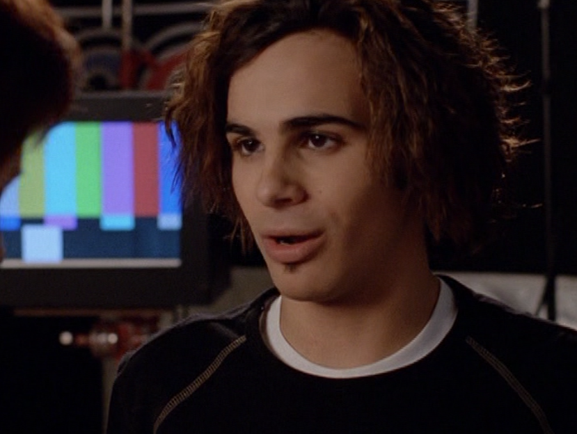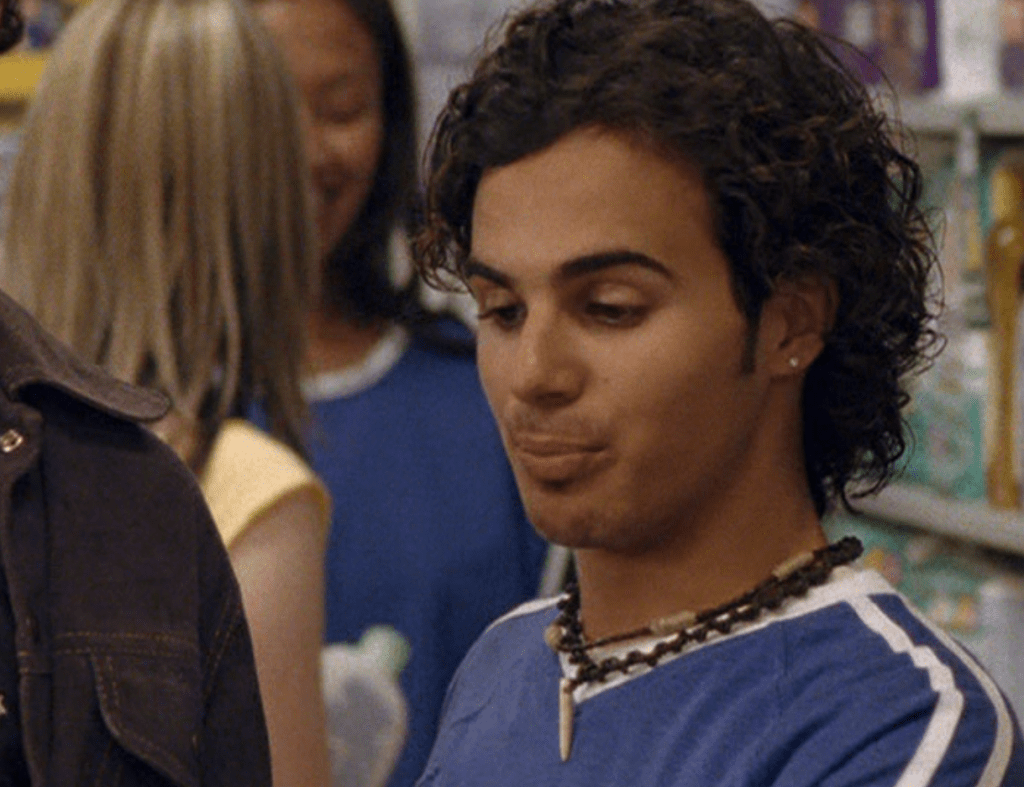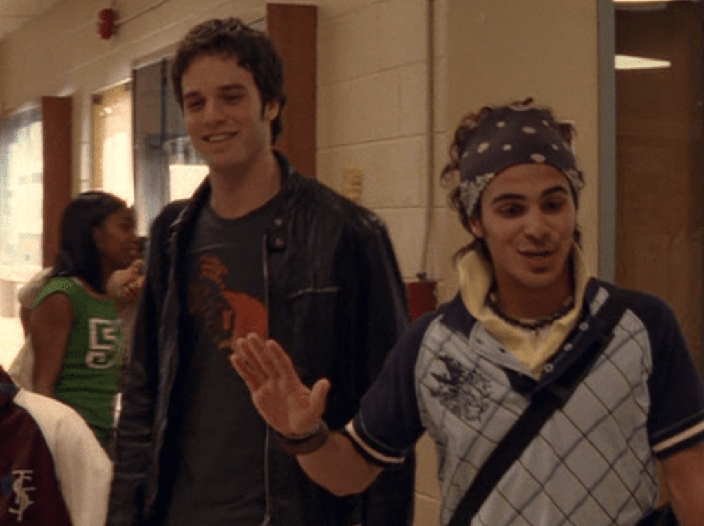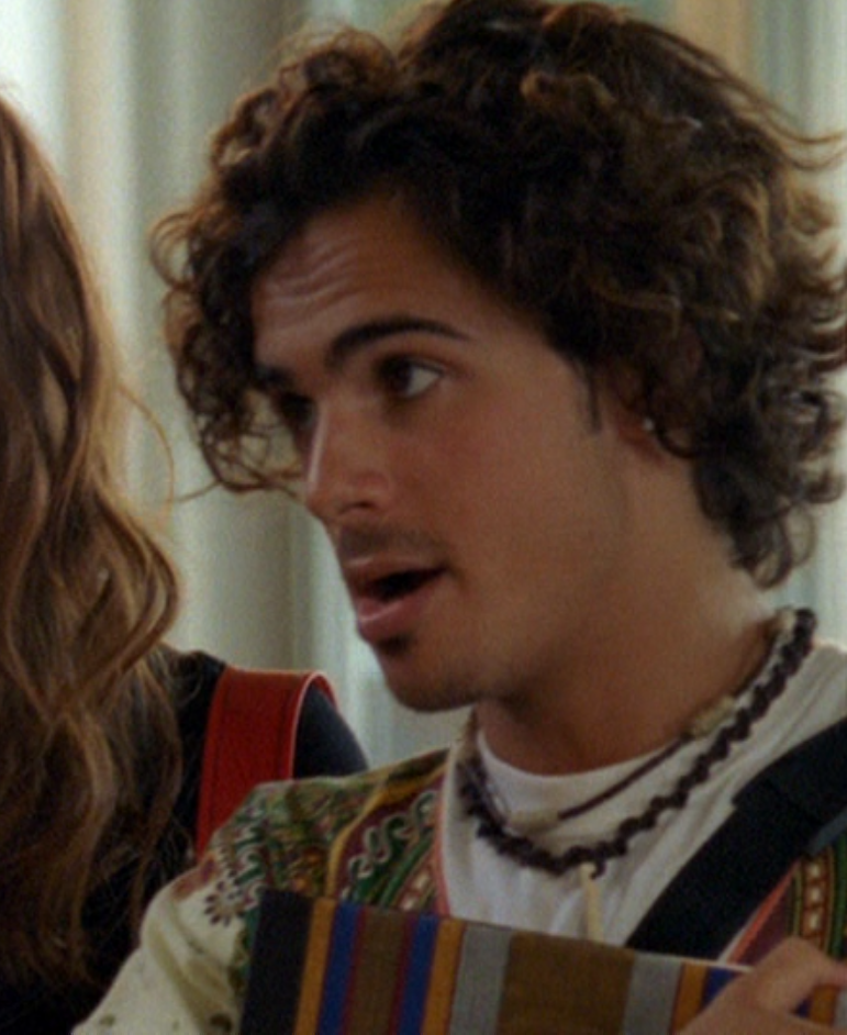 Oh man, it’s time for Marco’s moment. First he’s in a zip up jacket, hoodie, and some kind of like comic book shirt. Also shout out the soul patch, don’t know if I’ve ever mentioned it before, but there it is, looking itchy. Next Marco is in just a standard graphic tee with something random & unrelated on it, and I like his hair like this – curly and tucked behind the ears. He’s also seen helping with the blood drive in casual khakis and this red blood vest. Oh yeah, he’s being told he can’t give blood because he’s gay. Yeesh. Next, the outfit continues on, and we’re in Dylan’s dorm. Here we can see that these casual khakis are also FLARED! Shoutout to Marco’s flares, I feel like no one ever mentions them but I am such a fan of men in flares. I was hoping it would come back big time for men when flares circled around in the late 90s/2000s, but sadly it was mostly girls wearing them. Marco also seems to have this decorative belt on his waist, and lugs around a messenger bag. And he freakin walks in on Dylan with another guy. And Dylan’s like, “Oh hey Marco!” Brutal. Marco tries his best to suck it up, so he appears at the dorm party in an orange sleeveless tee with flare jeans. Oh yeah and plants a smooch on Craig. Our last look is Marco in a dark long sleeve, with hair hair still big.