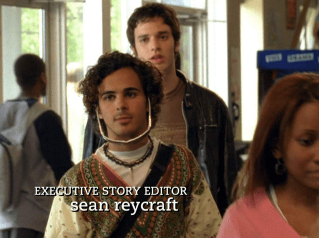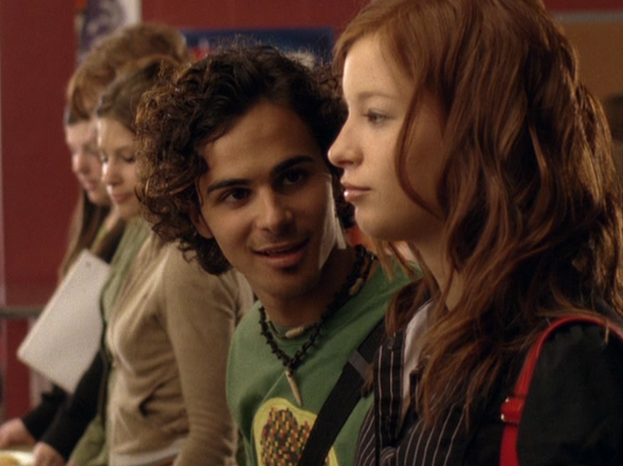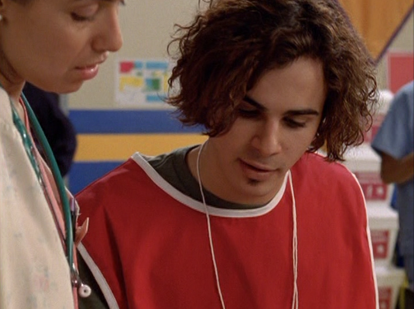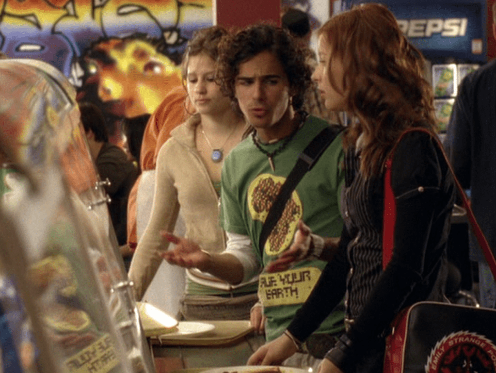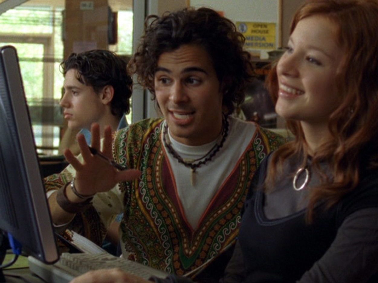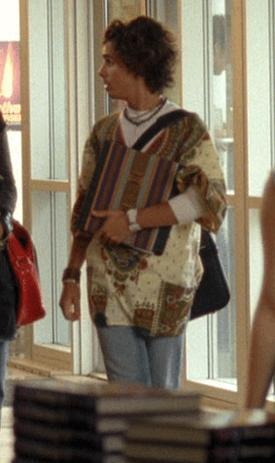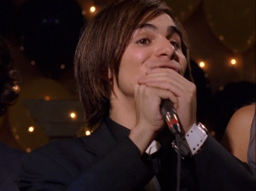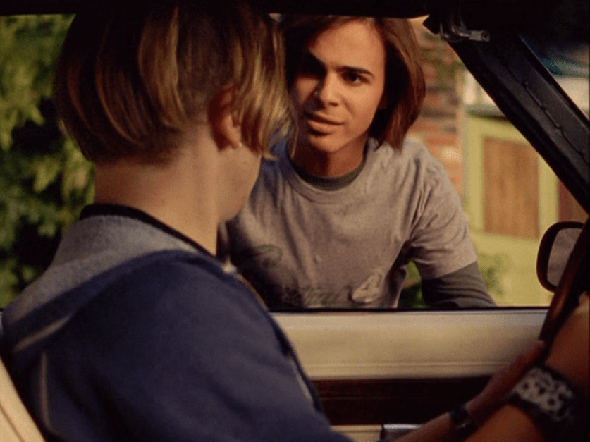 Oh man, it’s time for Marco’s moment. First he’s in a zip up jacket, hoodie, and some kind of like comic book shirt. Also shout out the soul patch, don’t know if I’ve ever mentioned it before, but there it is, looking itchy. Next Marco is in just a standard graphic tee with something random & unrelated on it, and I like his hair like this – curly and tucked behind the ears. He’s also seen helping with the blood drive in casual khakis and this red blood vest. Oh yeah, he’s being told he can’t give blood because he’s gay. Yeesh. Next, the outfit continues on, and we’re in Dylan’s dorm. Here we can see that these casual khakis are also FLARED! Shoutout to Marco’s flares, I feel like no one ever mentions them but I am such a fan of men in flares. I was hoping it would come back big time for men when flares circled around in the late 90s/2000s, but sadly it was mostly girls wearing them. Marco also seems to have this decorative belt on his waist, and lugs around a messenger bag. And he freakin walks in on Dylan with another guy. And Dylan’s like, “Oh hey Marco!” Brutal. Marco tries his best to suck it up, so he appears at the dorm party in an orange sleeveless tee with flare jeans. Oh yeah and plants a smooch on Craig. Our last look is Marco in a dark long sleeve, with hair hair still big.