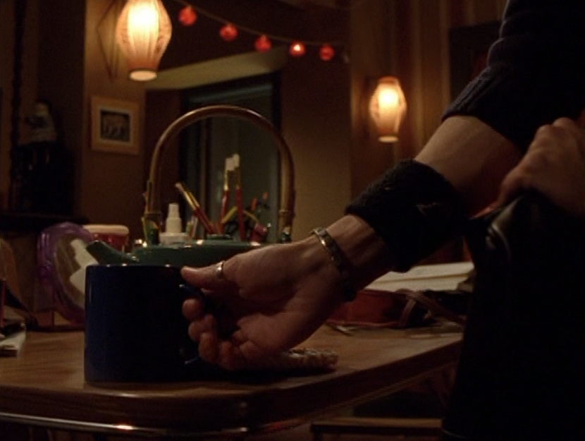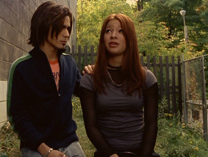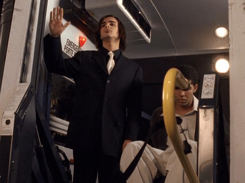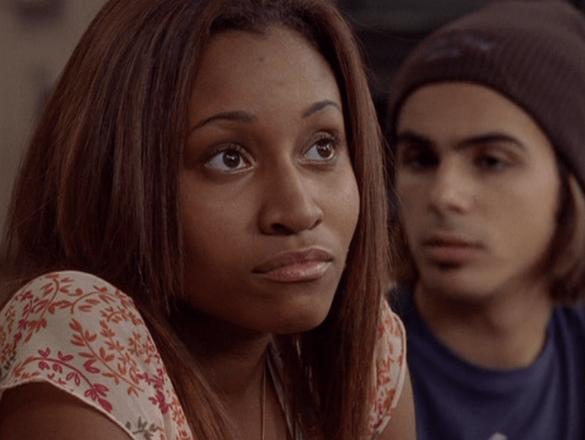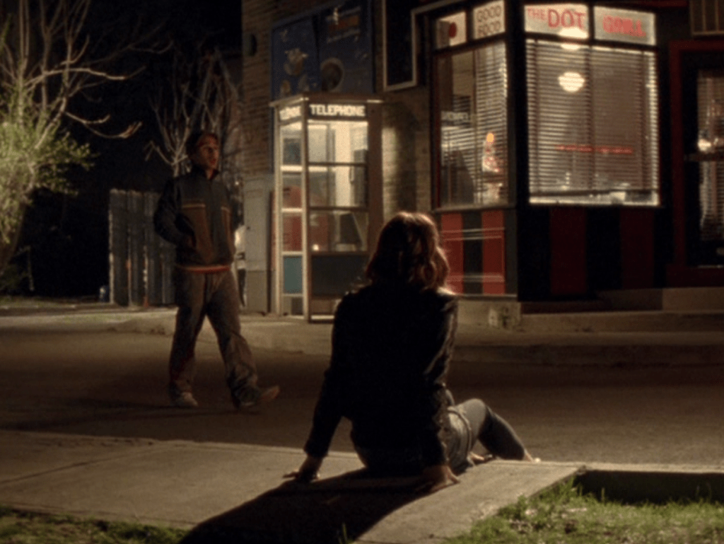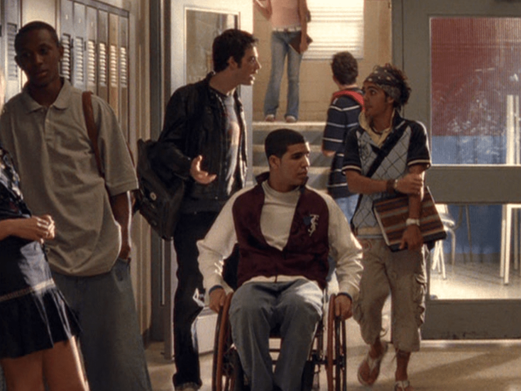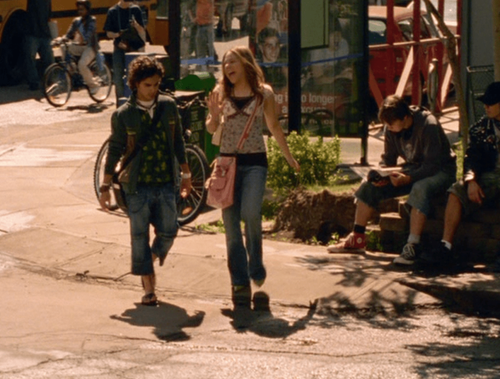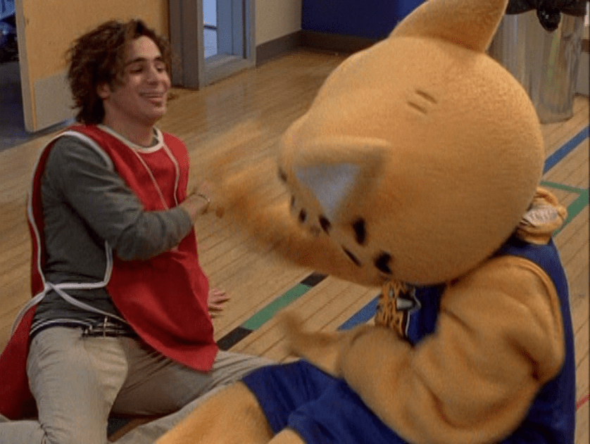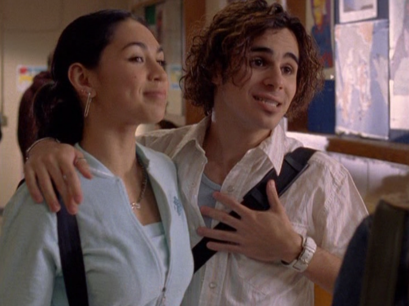 Oh man, it’s time for Marco’s moment. First he’s in a zip up jacket, hoodie, and some kind of like comic book shirt. Also shout out the soul patch, don’t know if I’ve ever mentioned it before, but there it is, looking itchy. Next Marco is in just a standard graphic tee with something random & unrelated on it, and I like his hair like this – curly and tucked behind the ears. He’s also seen helping with the blood drive in casual khakis and this red blood vest. Oh yeah, he’s being told he can’t give blood because he’s gay. Yeesh. Next, the outfit continues on, and we’re in Dylan’s dorm. Here we can see that these casual khakis are also FLARED! Shoutout to Marco’s flares, I feel like no one ever mentions them but I am such a fan of men in flares. I was hoping it would come back big time for men when flares circled around in the late 90s/2000s, but sadly it was mostly girls wearing them. Marco also seems to have this decorative belt on his waist, and lugs around a messenger bag. And he freakin walks in on Dylan with another guy. And Dylan’s like, “Oh hey Marco!” Brutal. Marco tries his best to suck it up, so he appears at the dorm party in an orange sleeveless tee with flare jeans. Oh yeah and plants a smooch on Craig. Our last look is Marco in a dark long sleeve, with hair hair still big.
