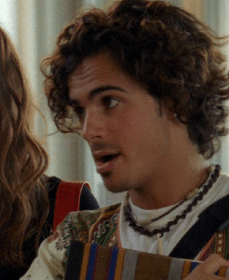 Marco’s style is so cool. It’s so intentional, so eclectic, so multi-faceted and layered. I really do like it, because we have a severe lack of stylish guys on the show. In my opinion, it’s not exactly about whether or not Marco’s clothes are my taste. It’s more about the fact that I can tell there’s sooo much curation behind it. It’s got Marco’s intentions and self-expression so strongly. There seems to be so much autonomy behind his ensembles. He’s not just wearing what’s “cool” or what’s easy, he is experimental and I respect that so much. The first outfit is a very 2000s looking striped polo with a shark tooth necklace. And lovely curly hair. Next – you know Marco is the king of capris – he wears these cropped jeans, flip flops, and a green jacket layered over some wild green printed shirt. He seems to combine boho with athletic and it’s so odd but cool!