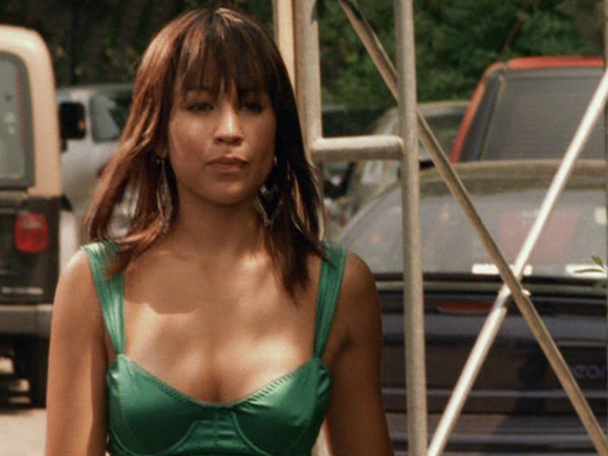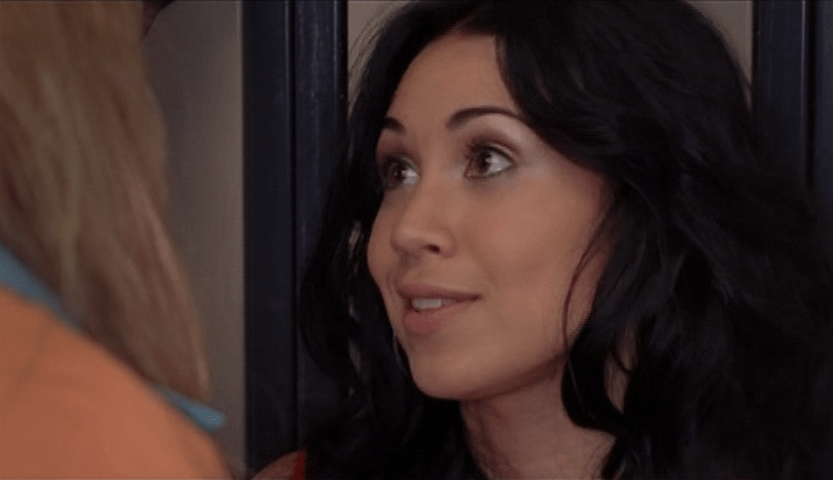 But let’s move on to the fashion. We start off with this swimsuit moment, featuring Manny in a hot pink bikini and large sunnies. And let me just say, I am LIVING for this S5 Manny hair. I ADORE these voluminous and perky shag. Next, her brows are waxed, her earrings are big, her tank is tight, and her khakis are low. Then she goes to the mall and tries on blonde wigs. What is our fixation with blondeness anyway? We briefly see her in a nice sequined tank layered over another tank and under a cardi. OH, I see, she’s trying these clothes on in the store. She’s also got low-rise jeans and a grommet belt here.