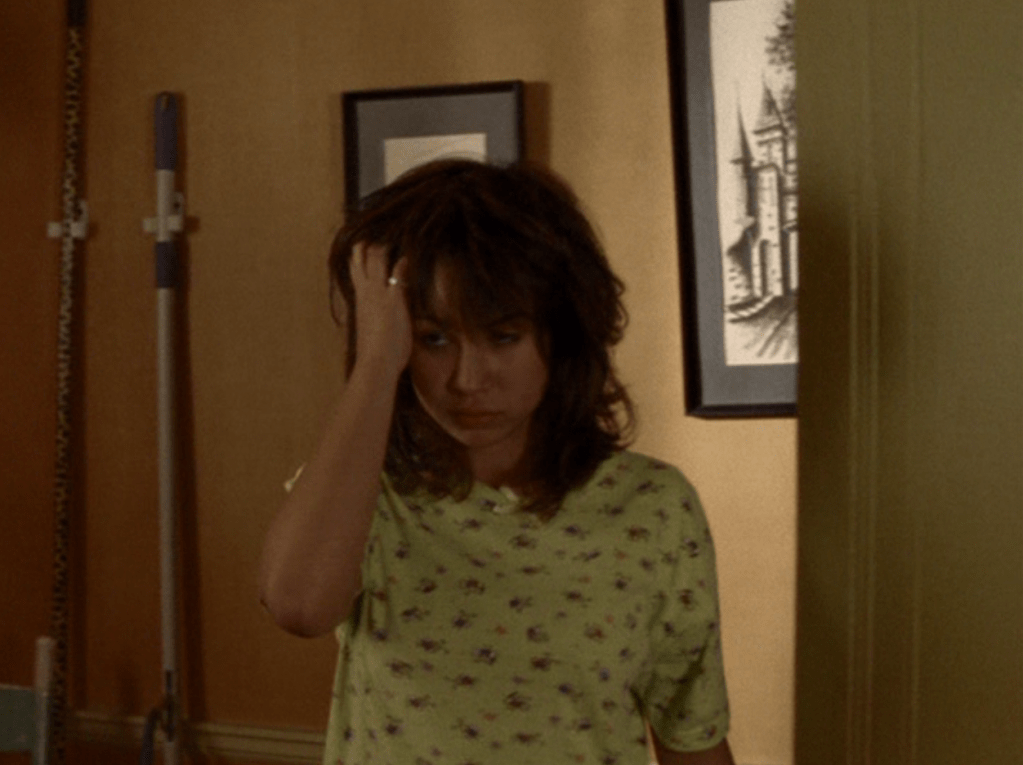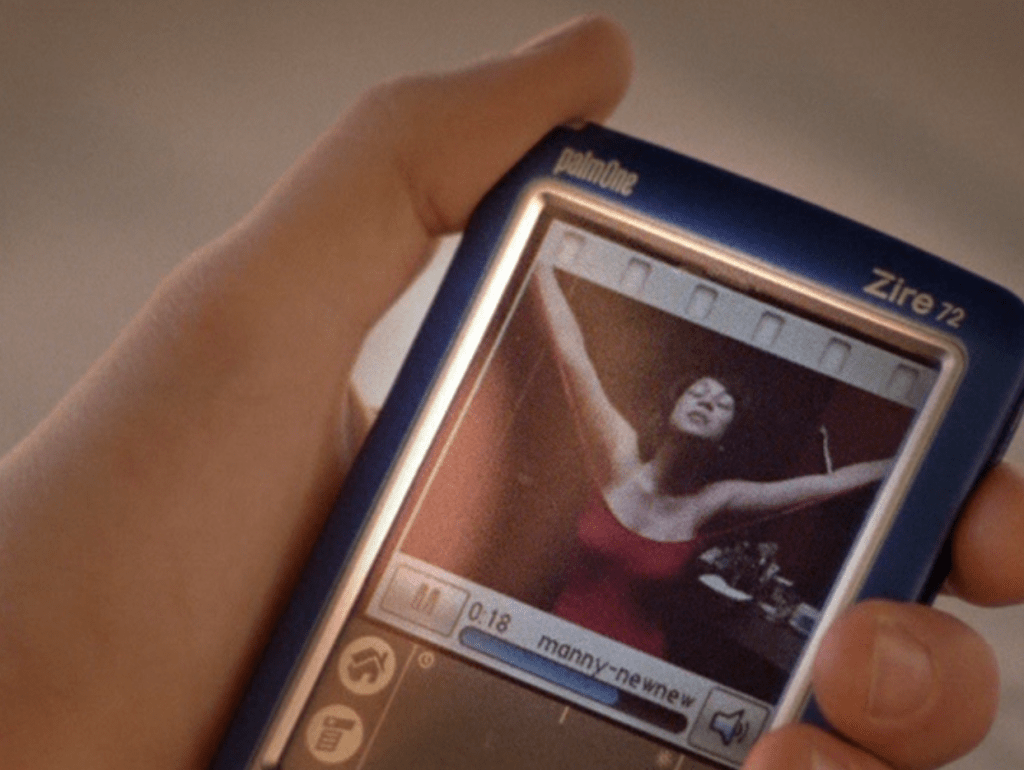 Next, for her impromptu audition with a talent agent, she wears gold wedges, a yellow ruffled mini skirt, and a matching tiny vest over what seems to be a bandeau. I mean, she really went all out for this look. Those tiny vests were SUCH a thing, I hope more of these show up as we go along. But the talent agent just let her have it. Then, we have a moment with this flip phone before we are back at school. I’m counting old tech as fashion. Manny is wearing her very famous stretchy orange halter under a weird green and orange zip up hoodie. Damn that hair is flouncy! She ties the hoodie around her waist to get verbally abused by her parents… before she goes to a rock-bottom party… where… well, you know what happens.