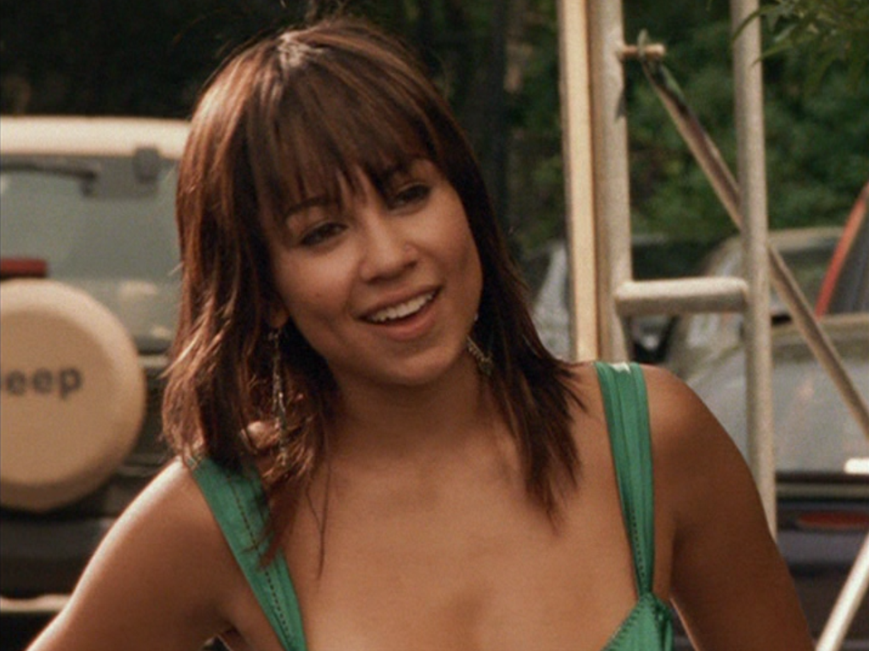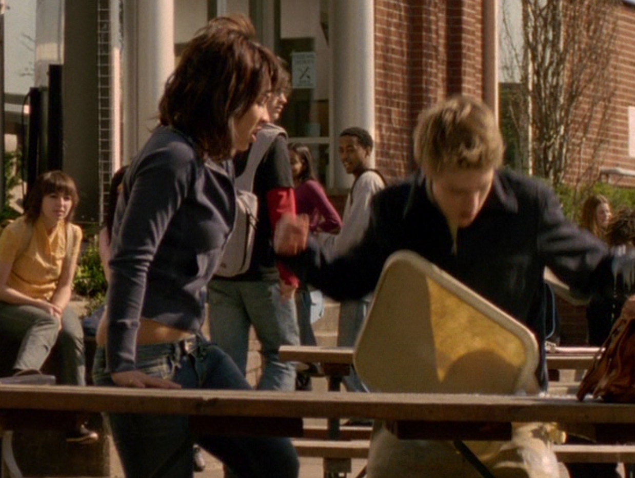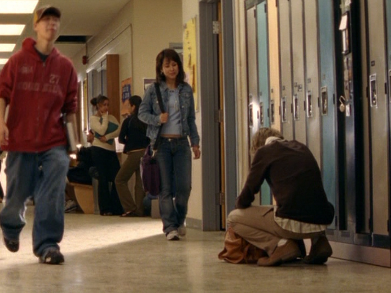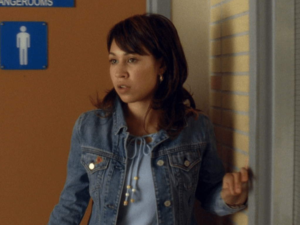 This is an interesting little episode, where Paige really starts to wear Manny down, making her life miserable. Manny tries her best to fight back but I think Paige holds more power here. I wish this saga could have been drug out a little bit. Oh well! First Manny is seen in Spirit Squad practice. Then she’s wearing a matchy-matchy velour set over a tube top with those square hoop earrings. And that pink plastic watch still, lol. She’s also still wearing her VEGAS necklace, which I still love. And unfortunately she has picked the same dress as Paige for the dance. I love it – pink, ruched, and super ruffly strapless with a dropped waist. However, the length of the dress is kinda weird, cutting off at like mid-calf, which doesn’t seem like something someone would wear during this period. Next we return to school and see the Spirit Squad uniform on her, and later those famous low-rise jeans paired with a red athletic-inspired top. Her hair looks amazing here btw. Next… Manny is being tortured in the mascot outfit. And then she returns to the dress store – I guess Paige chased her out last time – and tries on a funeral ensemble. Ultimately, though, she decides on the pink because she broke Paige’s leg and decided she deserved a treat. That’s where you can see the odd length of the dress – it kinda makes her legs look ultra-short. The shoes are odd too, like, kitten pumps. Aaand, uh oh – Paige shows up at the dance, and they have the same dress! So, Paige rips Manny’s off, and here is her underwear. Never seen a teenage girl wear underwear like this before. Finally, she’s in the locker room in a hoodie. We don’t really see Manny in hoodies, do we?