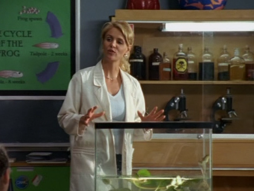 Ms. H is wearing an updo, an all-pink getup, silver jewelry, and a lab coat of course, because that’s what science teachers wear.